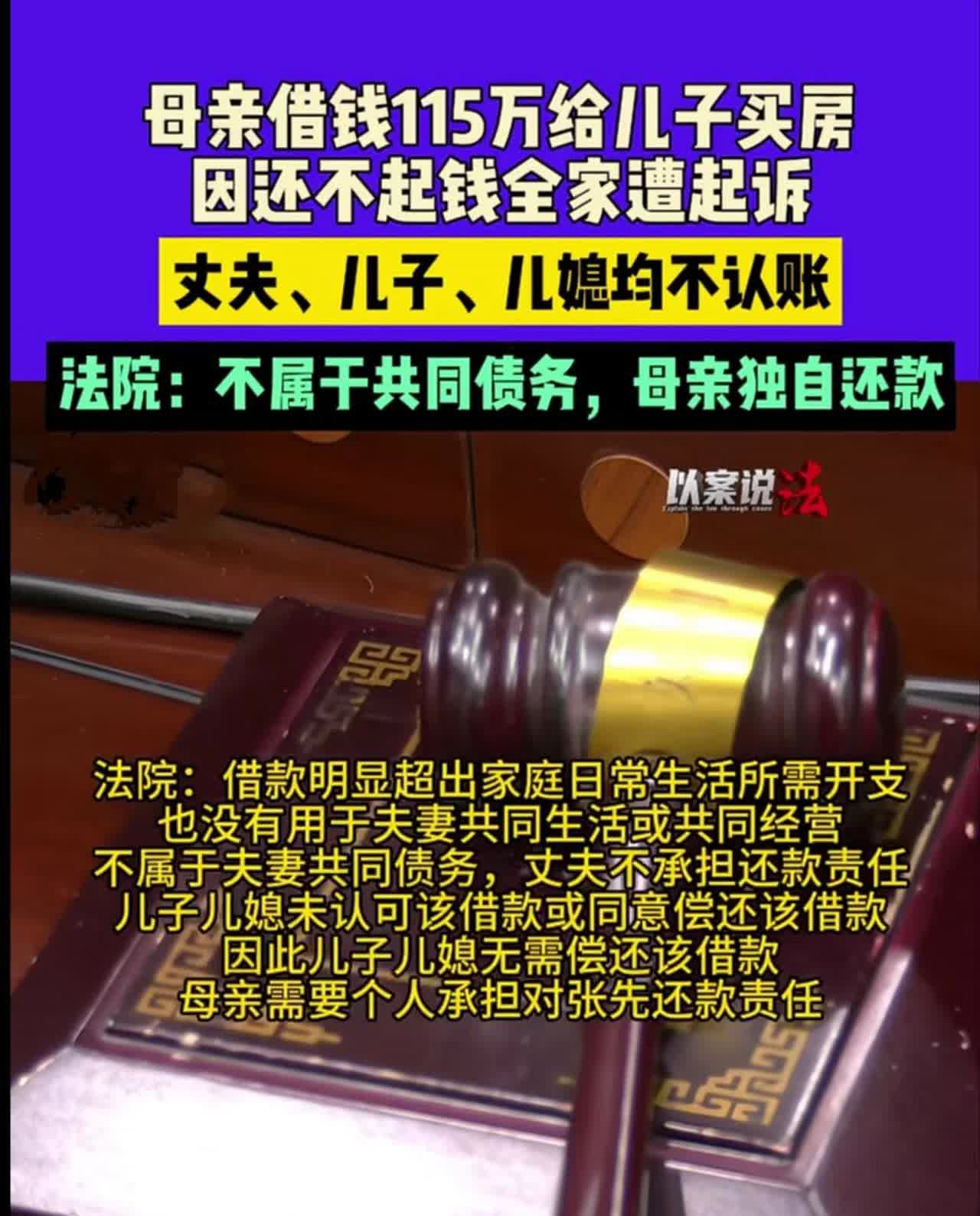 不要轻易借钱给别人,因为会打水漂! 一男子借115万给朋友,朋友把钱作为首付,给儿子买房。由于种种原因没有在约定时间还钱。随后把朋友一家告上法庭,最终败诉。只能由朋友一人来承担。 理由是:这笔钱不属于朋友夫妻共同债务,因为没有用于夫妻共同生活。朋友的儿子儿媳因为未同意该借款,也未承诺还那笔钱。 《民法典》说得清楚,一方在婚姻里以个人名义借的钱,要是超出家庭日常需要,又没用到共同生活、经营,或者不是夫妻一起商量好借的,就不算共同债务。 这事儿,就刚好撞上这情况,朋友丈夫才能 “甩锅”。 如果要借别人很多钱,一定要夫妻双方都签字摁手印,还有把借款用途、谁负责还这些写清楚,别到最后扯不清。