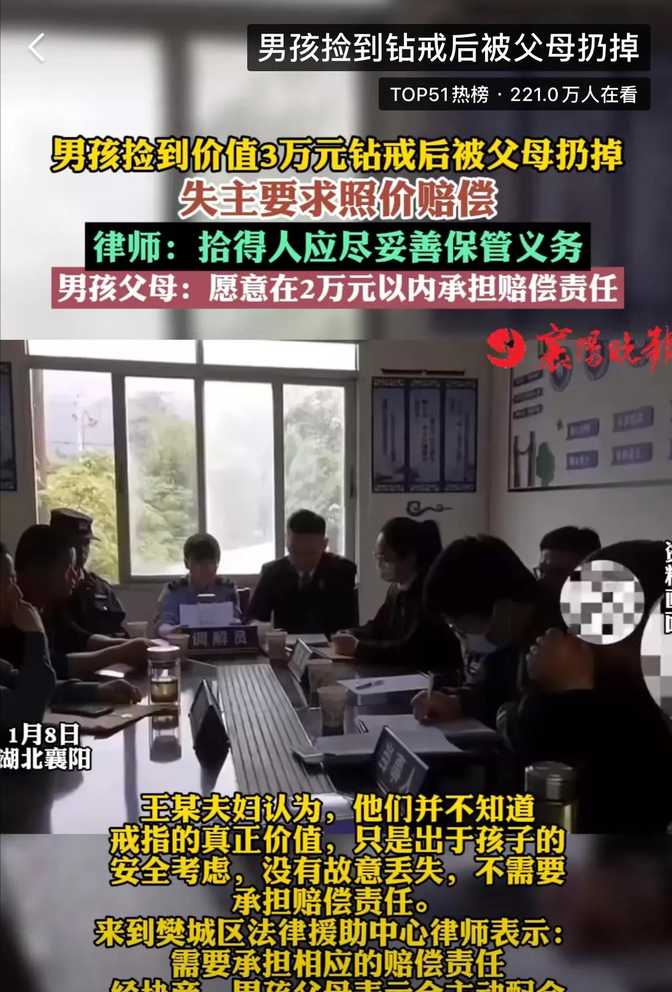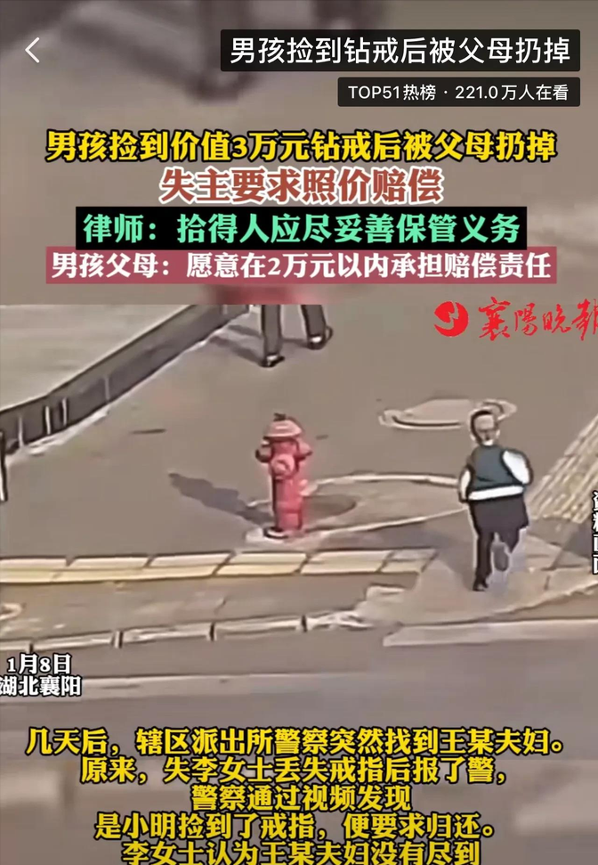 过了几天,麻烦来了。戒指的失主找上门,说那是枚价值3万的钻戒,还报警了。警方调了监控,发现确实是这孩子捡的,妈妈扔的。失主要求赔偿,说妈妈没保管好戒指,害她丢了贵重物品。民警也表态,依据法律,捡到东西得好好保管,不然得赔。 这妈妈懵了。她觉得自己挺冤的:第一,她不知道那是真钻戒,以为是玩具;第二,她没拿走戒指,也没占便宜,怎么就得赔3万?可失主和警方态度很明确,法律就是这么规定的。