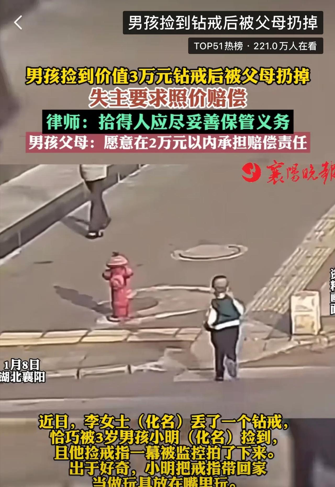 “天降大锅”!湖北襄阳,3岁儿子在路上玩耍时,妈妈突然发觉其口中含物。为防吞下,掏出一看竟是钻戒,误认作玩具便丢弃了。未料,失主竟寻上门来,声称:“赔钱,那可是价值三万元的真戒指啊!”民警:保护不当,应当赔偿!从法律的角度上来看,该如何认定这件事呢? 试想一下,在一个寻常的周末,你带着孩子于公园嬉戏,彼时阳光恰到好处,微风轻柔地拂面而来。突然之间,你发觉孩子嘴里含着一样东西,赶忙掏出来一瞧,竟是一枚亮晶晶的戒指。你以为是玩具,随手扔了。孰料,数日之后,竟有人登门造访,宣称那是价值三万的真钻戒,还要求你作出赔偿!民警还说你保护不当,得担责。这事听起来像电视剧,但就真发生在湖北襄阳。从法律角度看,这“天降大锅”到底该怎么判? 这事发生在湖北襄阳,一个妈妈带着3岁儿子在公园玩。孩子年幼,好奇心颇重,捡到物件便往嘴里塞。那天,妈妈发现他嘴里有东西,赶紧拿出来,是个戒指。她瞅了瞅,觉得就是个普通玩具,没多想就扔了。毕竟,公园里丢个塑料戒指,谁会当回事呢?