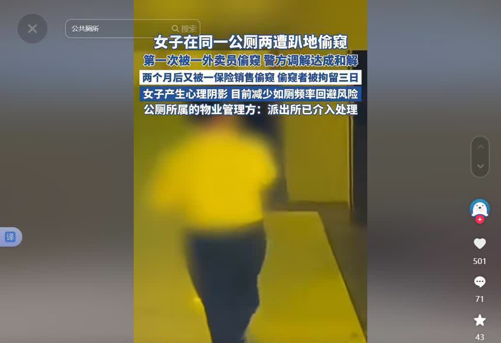山东济南,女子两次在同一个女厕所隔间里遇到陌生男子趴地偷窥,更无语的是,两次都是听到可疑脚步声,她凭着警觉用手机拍下了对方的身影。第一次还是个外卖小哥,第二次换成了保险公司销售,对方甚至还趴在地上,像青蛙似的从门缝往里看...... 在山东济南的一栋办公楼里,有位王女士(我们就叫她小王吧)碰到了件让人头疼的事儿。她在用公共厕所的时候,竟然两次被人趴在地上偷看。这事儿吧,还不是碰巧,是有人故意干的,而且两次还不是同一个人,一次是个送外卖的小哥,另一次是个卖保险的销售。 小王平时上班,用楼里的公共厕所挺正常的。但今年四月的一天,她正在厕所里呢,突然听到外面有轻轻的脚步声,走得慢吞吞的,好像怕被人发现似的。她心里一嘀咕,就从门缝往外看,结果看到一个黑影子趴在地上,正往里瞅呢。小王吓得赶紧用手机拍了张照片,外面那人发现被发现了,吓得撒腿就跑。 其实啊,这已经不是头一回了。四月中旬的时候,小王就碰上过一回,那次是个外卖员。那时候她第一次碰到这种事,对方道歉挺诚恳的,她就心软了,没追究。但这回,她可不打算再放过这种行为了。她尽量少上厕所,时刻留神,可没想到坏事儿又找上门了。这次她毫不犹豫地打了报警电话,用手机拍的照片和商场的监控一起交给了警察。警察很快就找到了那个坏人,原来他是个卖保险的。他不仅偷看,还学青蛙那样趴在地上,想从门缝里偷窥女士们的隐私。 结果,那个男的被警察抓了,关了三天。商场的管理人员也被叫去谈话,让他们整改。王女士决定用法律来保护自己,同时也告诉大家:在公共场合,得多留个心眼儿,看好自己的隐私。