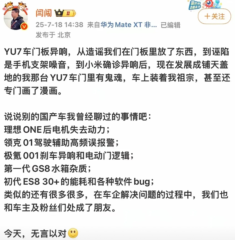 知名大V闫闯刚提的小米YU7就出问题了。阎老师对刚提小米YU7进行评测,发现该车过坑时候后门出现异响,回到平路后恢复正常,还说是个例。就是这么真实反馈,居然遭到某些极端粉丝的质疑,什么帽子都往他身上扣,比如被充值、在后门放东西或者说异响来自手机支架等,就是不能说车存在问题。 之前还有博主发向雨7方向盘往右偏的问题,也是遭到极端粉丝的疯狂攻击。难道小米汽车只能说优点,比如马力大、跑的快、好看等,不能说缺点,就算是真实情况也不行?真实太匪夷所思了。