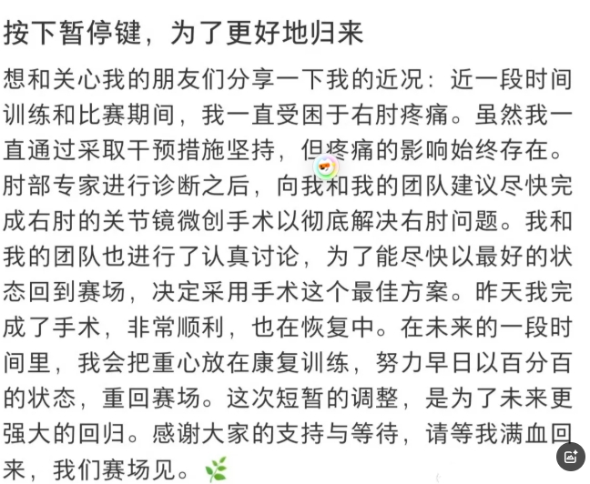 郑钦文发文晒病床照:昨天完成了困扰自己已久的右手肘微创手术。