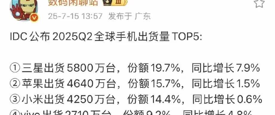 2025年第二季度全球手机出货量,没想到三星排第一,比苹果还多。 对我来说,现在手机就两种,一种是苹果,一种是安卓,苹果手机买的最多,也是很多人觉得苹果手机好用,这个就不用说了。 但是三星呢?也是安卓,系统方面和国产比,感觉不行,功能没有那么多,可玩性不高,流畅度也是差不多。电池小,充电慢,而且价格也贵。不明白三星为什么在全球这么受欢迎,看看在中国都没什么人买。[泪奔]