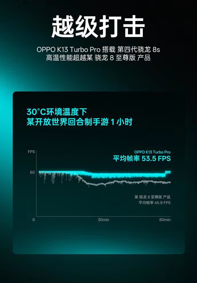 神医啊!这下终于不担心手机发烫了。真觉得大部分手机一到夏天就成了见不得光的东西,放在口袋里还没走两步就开始发烫了,更别提玩游戏了,分分钟卡到怀疑人生好吗? 所以这回OPPO K13 Turbo 疾风散热超级套装一出来,我就觉得有救了!这回就算大太阳底下打排位,都不怕手机扛不住了~ 而且疾风散热引擎+疾风散热超级套装的收益比我预想的还高......骁龙8s Gen4都跑到245万了,一小时玩下来手机帧率甚至比骁龙8至尊版机型还要好,越级打击这不顶吗? 而且看OPPO自己放出来的测试,同样的环境下,别的手机都已经掉帧了,K13 Turbo居然还能保持120帧继续干农活,整机温度也比较低...... 这下真的忍不住想看,OPPO在7月21日发布会现场还能掏出什么惊喜来!