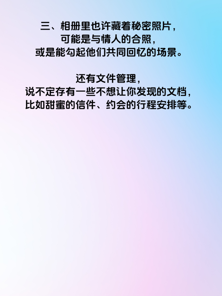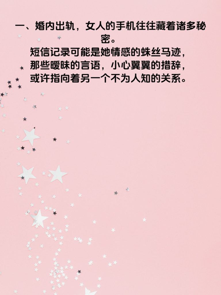 一、婚内出轨,女人的手机往往藏着诸多秘密。短信记录可能是她情感的蛛丝马迹,那些暧昧的言语,小心翼翼的措辞,或许指向着另一个不为人知的关系。 二、聊天软件里的对话框,她可能刻意删除了某些关键对话,或是设置了隐秘的聊天背景。仔细留意她在社交平台上的互动,是否有频繁与某个人的私聊,却又总是避开你的视线。 三、相册里也许藏着秘密照片,可能是与情人的合照,或是能勾起他们共同回忆的场景。还有文件管理,说不定存有一些不想让你发现的文档,比如甜蜜的信件、约会的行程安排等。 四、手机的应用使用记录也不容忽视。她常用的某些小众软件,也许是与情人交流的专属工具。甚至她的浏览记录,可能暴露了她内心渴望的情感世界,那些搜索的内容,或许就是她出轨情感的映照。 五、面对这些可能存在的秘密,男人不应盲目猜忌,而是要冷静观察。但如果真的发现了问题,也需坦诚沟通,解决婚姻中潜藏的危机,守护曾经的爱情与承诺。