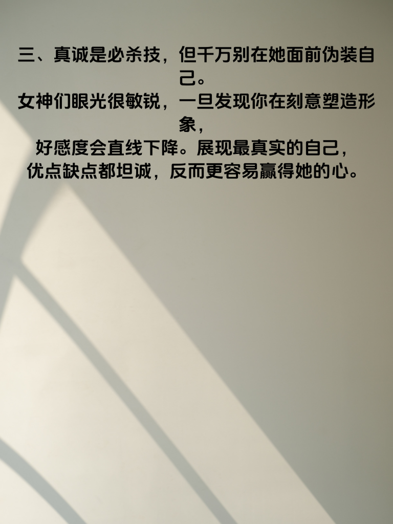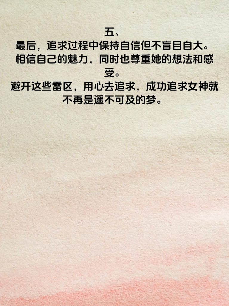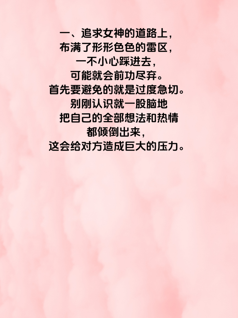 一、追求女神的道路上,布满了形形色色的雷区,一不小心踩进去,可能就会前功尽弃。首先要避免的就是过度急切。别刚认识就一股脑地把自己的全部想法和热情都倾倒出来,这会给对方造成巨大的压力。 二、尊重她的个人空间也至关重要。每个人都有自己的生活节奏和隐私,不要时刻追问她的行踪或者对她的生活指手画脚。 三、真诚是必杀技,但千万别在她面前伪装自己。女神们眼光很敏锐,一旦发现你在刻意塑造形象,好感度会直线下降。展现最真实的自己,优点缺点都坦诚,反而更容易赢得她的心。 四、还有,别在她面前贬低他人来抬高自己。这不仅显得你狭隘,还会让她怀疑你的人品。学会欣赏他人,也让她看到你积极善良的一面。 五、最后,追求过程中保持自信但不盲目自大。相信自己的魅力,同时也尊重她的想法和感受。避开这些雷区,用心去追求,成功追求女神就不再是遥不可及的梦。