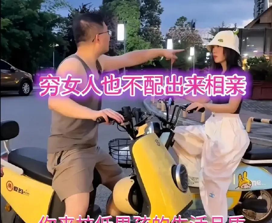 在贵州,一名男子骑电瓶车去相亲,被女子嫌弃。都奔30的人了,连四个轮的车都没有,太寒酸了,这样还敢出来相亲,谁愿意嫁给你。 从视频中看,男子骑着电瓶车见到了相亲女子,相亲女子同样骑电瓶车过来,可男子都没说什么,女子却说:你怎么骑电瓶车来相亲,也太不尊重我了,看得出女子一脸嫌弃。 男子听后,问女子,骑电瓶车是为了堵车时方便,你不是也骑电瓶车过来吗?骑电瓶车有什么不好的,为什么你能骑我不能骑? 女子振振有词的说:你骑个破电瓶车来相亲,一看就是个穷酸样,相亲这种场合,Z起码也开一辆四个轮子的小车过来,难道你连车都没有。 男子生气了,我就喜欢骑电瓶怎么了?你不也是骑电瓶车过来吗,凭什么看不起我呀?你有你开过来。 女子说:因为我是女孩,我不用买车,我可以选择有房有车的男人嫁,你是男人你不可以,你作为一个男人,没房没车,谁会愿意嫁给你。 既然你没车,那你有房吗?房也没有,你没房没车,出来相什么亲,我就是没房没车才要求你有,你什么都没有,还出来相亲。男子说:你也是个穷女人,也不配出来相亲。 女子又说:你还看不上我,我不愁嫁,但是你会一直光棍,现在这个社会,男多女少,我还会担心嫁不出去吗?走着瞧,到Z后是谁是单身。 男子回答:我就算光棍一辈子,也不会娶你,看你这身体长得太瘦,又不漂亮,我不喜欢你,你就收起你的虚荣心吧!Z终,两个人因没房没车谈不到一起,这场相亲失败。
