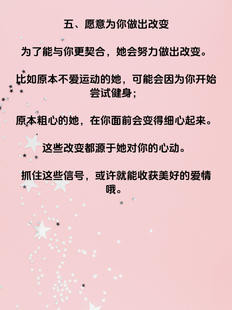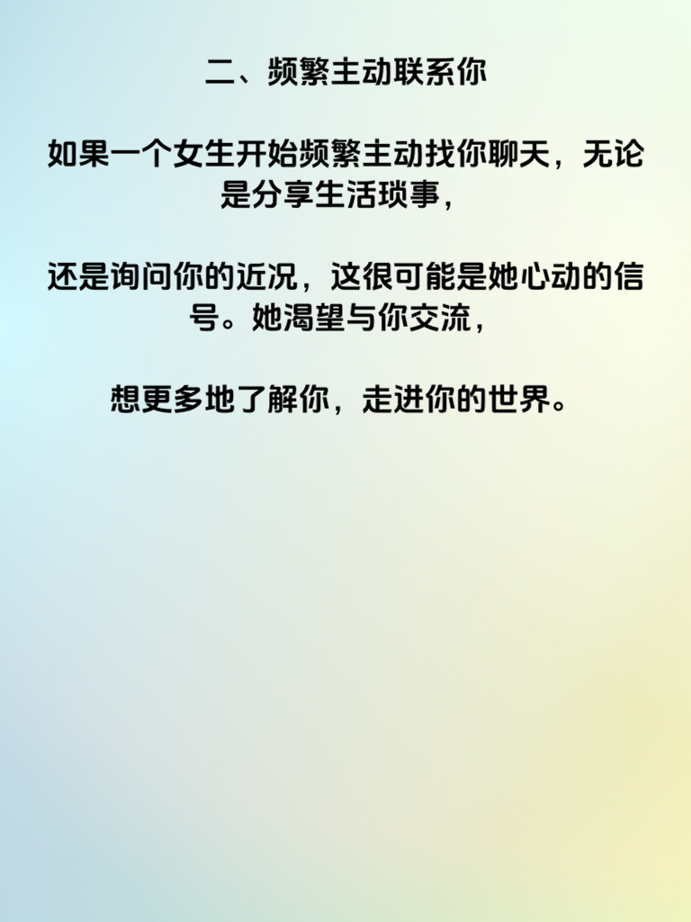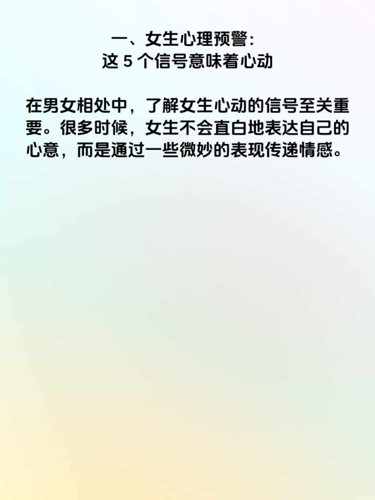 一、女生心理预警:这5个信号意味着心动,在男女相处中,了解女生心动的信号至关重要。很多时候,女生不会直白地表达自己的心意,而是通过一些微妙的表现传递情感。 二、频繁主动联系你,如果一个女生开始频繁主动找你聊天,无论是分享生活琐事,还是询问你的近况,这很可能是她心动的信号。她渴望与你交流,想更多地了解你,走进你的世界。 三、对你格外关注,她会留意你的一举一动,你的喜好、你的情绪变化她都放在心上。当你取得成就时,她会真心为你高兴;当你遇到困难,她会主动关心安慰。 四、在你面前注重形象,女生在喜欢的人面前往往会格外在意自己的形象。她会精心打扮,希望在你眼中始终保持最美的一面,力求给你留下好印象。 五、愿意为你做出改变,为了能与你更契合,她会努力做出改变。比如原本不爱运动的她,可能会因为你开始尝试健身;原本粗心的她,在你面前会变得细心起来。这些改变都源于她对你的心动。抓住这些信号,或许就能收获美好的爱情哦。