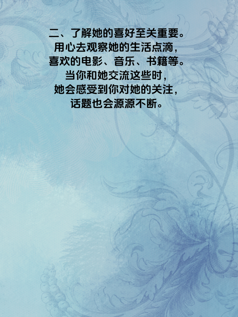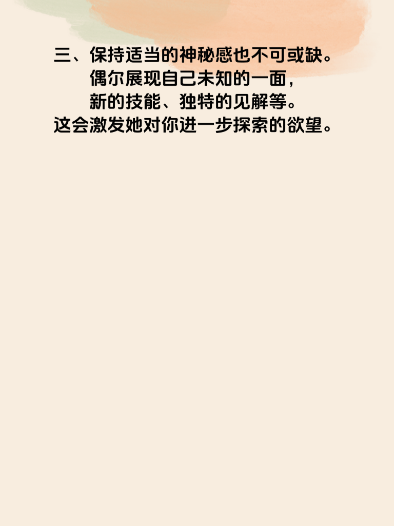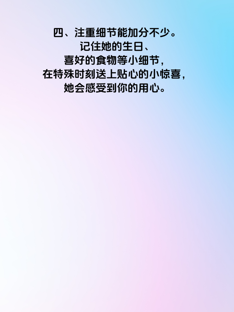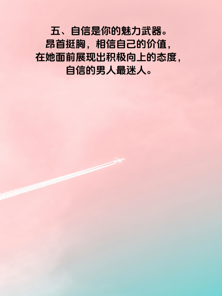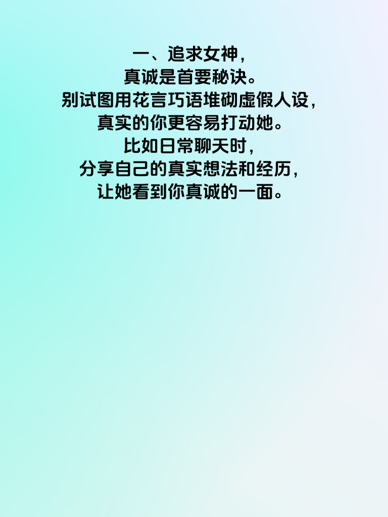 一、追求女神,真诚是首要秘诀。别试图用花言巧语堆砌虚假人设,真实的你更容易打动她。比如日常聊天时,分享自己的真实想法和经历,让她看到你真诚的一面。 二、了解她的喜好至关重要。用心去观察她的生活点滴,喜欢的电影、音乐、书籍等。当你和她交流这些时,她会感受到你对她的关注,话题也会源源不断。 三、保持适当的神秘感也不可或缺。偶尔展现自己未知的一面,新的技能、独特的见解等。这会激发她对你进一步探索的欲望。 四、注重细节能加分不少。记住她的生日、喜好的食物等小细节,在特殊时刻送上贴心的小惊喜,她会感受到你的用心。 五、自信是你的魅力武器。昂首挺胸,相信自己的价值,在她面前展现出积极向上的态度,自信的男人最迷人。 六、尊重她的选择和想法。无论大事小事,都认真倾听她的意见,让她知道她在你心中很重要,这样她才会更愿意靠近你。