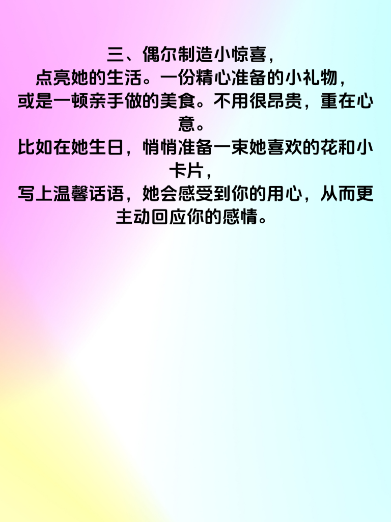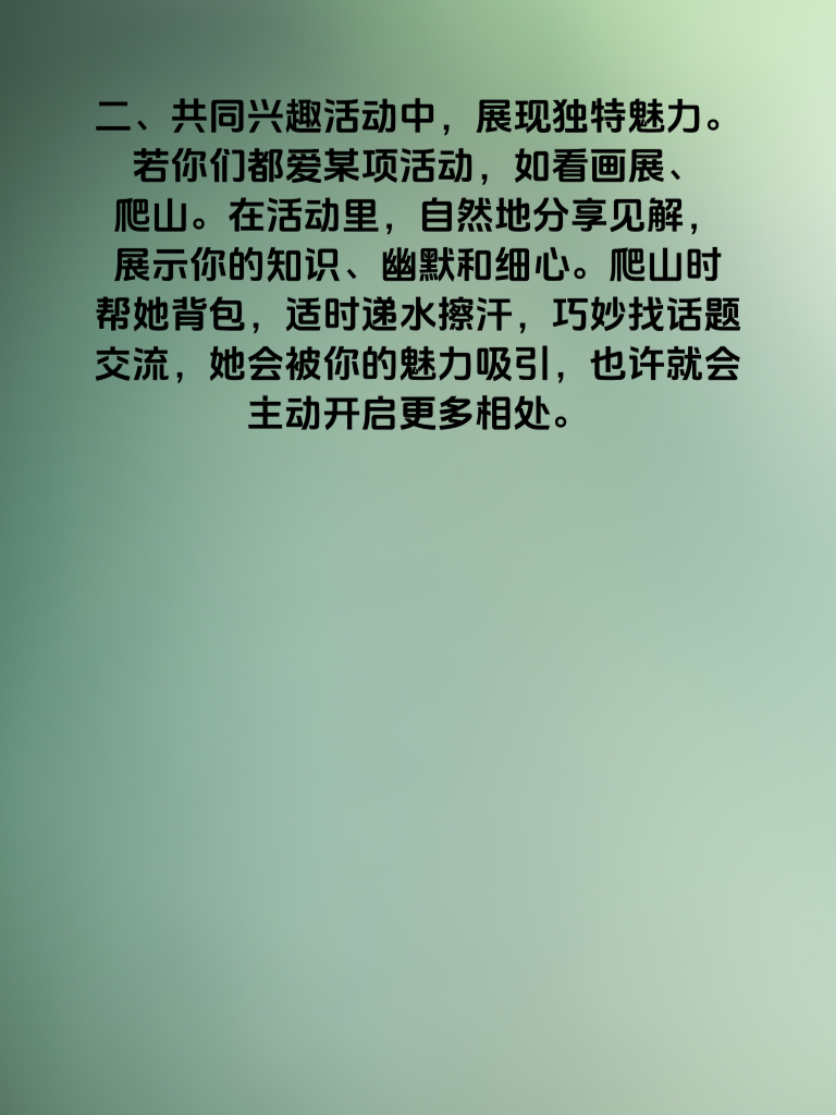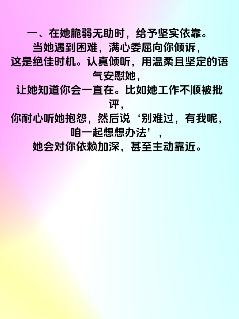 一、在她脆弱无助时,给予坚实依靠。当她遇到困难,满心委屈向你倾诉,这是绝佳时机。认真倾听,用温柔且坚定的语气安慰她,让她知道你会一直在。比如她工作不顺被批评,你耐心听她抱怨,然后说‘别难过,有我呢,咱一起想想办法’,她会对你依赖加深,甚至主动靠近。 二、共同兴趣活动中,展现独特魅力。若你们都爱某项活动,如看画展、爬山。在活动里,自然地分享见解,展示你的知识、幽默和细心。爬山时帮她背包,适时递水擦汗,巧妙找话题交流,她会被你的魅力吸引,也许就会主动开启更多相处。 三、偶尔制造小惊喜,点亮她的生活。一份精心准备的小礼物,或是一顿亲手做的美食。不用很昂贵,重在心意。比如在她生日,悄悄准备一束她喜欢的花和小卡片,写上温馨话语,她会感受到你的用心,从而更主动回应你的感情。