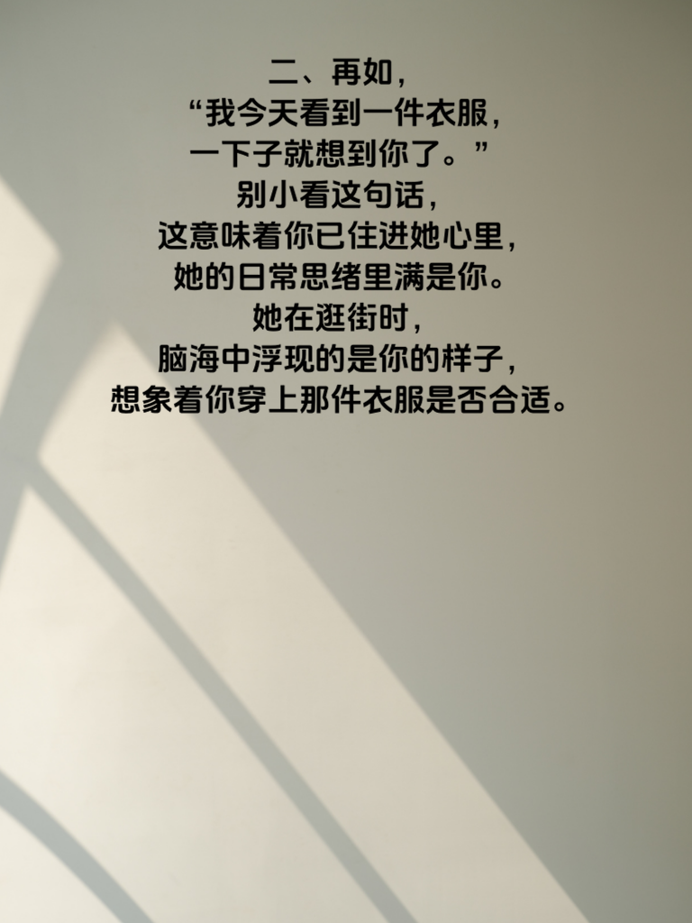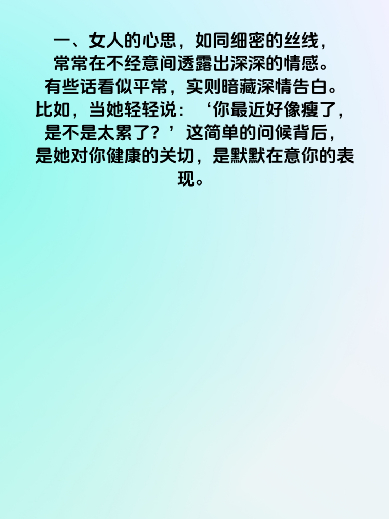 一、女人的心思,如同细密的丝线,常常在不经意间透露出深深的情感。有些话看似平常,实则暗藏深情告白。比如,当她轻轻说:‘你最近好像瘦了,是不是太累了?’这简单的问候背后,是她对你健康的关切,是默默在意你的表现。 二、再如,‘我今天看到一件衣服,一下子就想到你了。’别小看这句话,这意味着你已住进她心里,她的日常思绪里满是你。她在逛街时,脑海中浮现的是你的样子,想象着你穿上那件衣服是否合适。 三、还有那句‘我最近喜欢上一首歌,感觉歌词就像在说我们。’这表明她在生活中会主动将美好的事物与你关联,她渴望与你分享她的喜好,也期待你能走进她的情感世界,一起感受这份独特的共鸣。 四、男人若能听懂这些话背后的深情,就能更好地回应她的情感。当她说出这些话时,给予她温暖的回应,让她知道她的心意被珍视,如此,感情便能在这细腻的互动中不断升温。