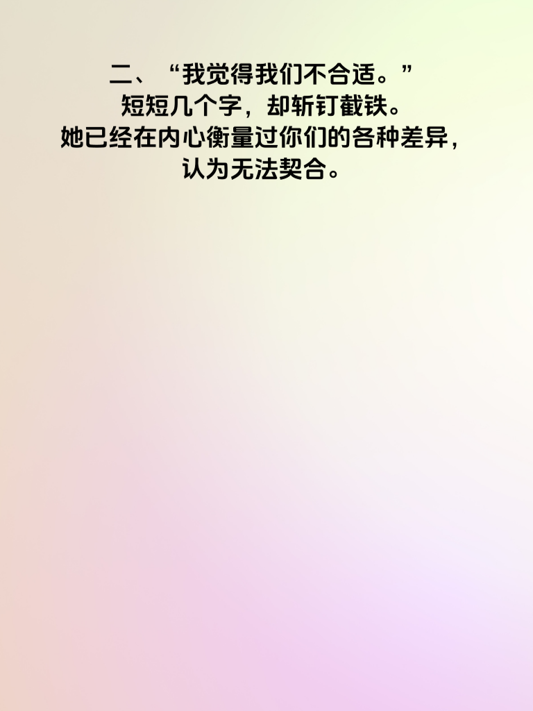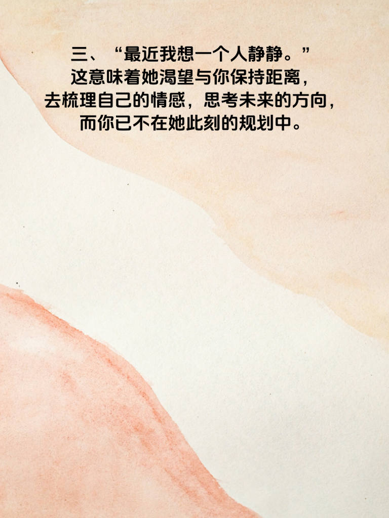 一、当女人心已走,她可能会说:“我们还是做朋友吧。”这看似委婉,实则是明确的信号。她不想再进一步发展亲密关系,友谊的界限是她给你的答案。 二、“我觉得我们不合适。”短短几个字,却斩钉截铁。她已经在内心衡量过你们的各种差异,认为无法契合。 三、“最近我想一个人静静。”这意味着她渴望与你保持距离,去梳理自己的情感,思考未来的方向,而你已不在她此刻的规划中。 四、男人要明白,听到这些话,别再盲目纠缠。尊重她的决定,给彼此空间。可以真诚地表达希望她未来幸福。然后,努力提升自己,让自己变得更优秀。也许有一天,当她看到全新的你,会重新审视你们的关系。但此刻,先学会放手,以退为进,才是更明智的做法。
