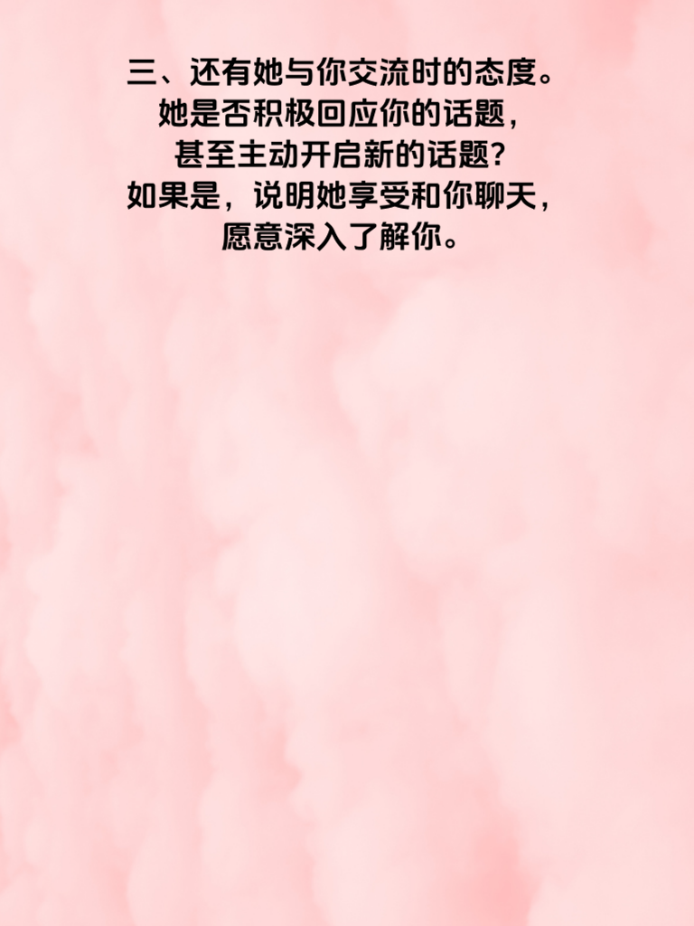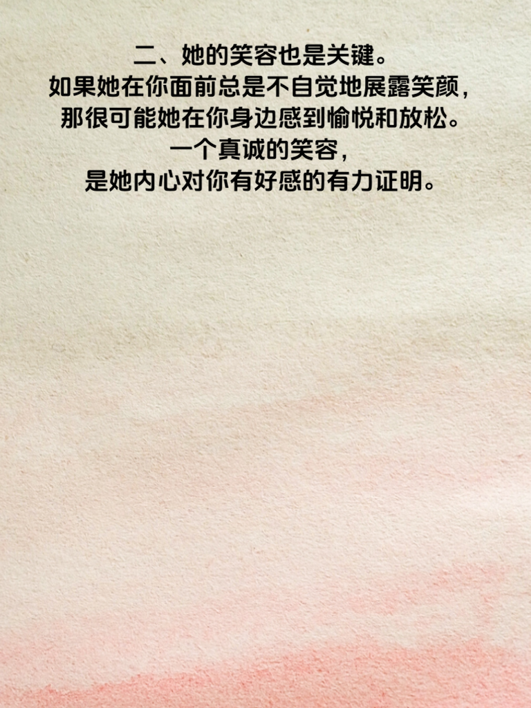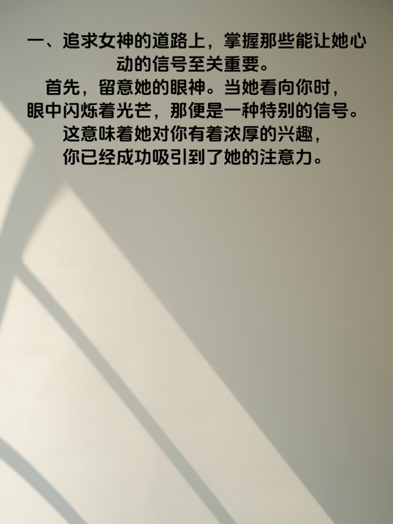 一、追求女神的道路上,掌握那些能让她心动的信号至关重要。首先,留意她的眼神。当她看向你时,眼中闪烁着光芒,那便是一种特别的信号。这意味着她对你有着浓厚的兴趣,你已经成功吸引到了她的注意力。 二、她的笑容也是关键。如果她在你面前总是不自觉地展露笑颜,那很可能她在你身边感到愉悦和放松。一个真诚的笑容,是她内心对你有好感的有力证明。 三、还有她与你交流时的态度。她是否积极回应你的话题,甚至主动开启新的话题?如果是,说明她享受和你聊天,愿意深入了解你。 四、她的身体语言也不容忽视。比如她会不自觉地靠近你,或者在倾听你说话时身体微微前倾,这些都是她对你有亲近之意的表现。 五、当她愿意和你分享她的生活点滴,无论是开心的事还是烦恼,那就表明她信任你,把你当成了重要的人。抓住这些信号,用你的真心去回应,就能让女神心动不已。