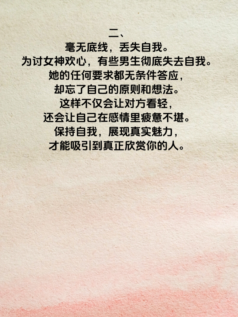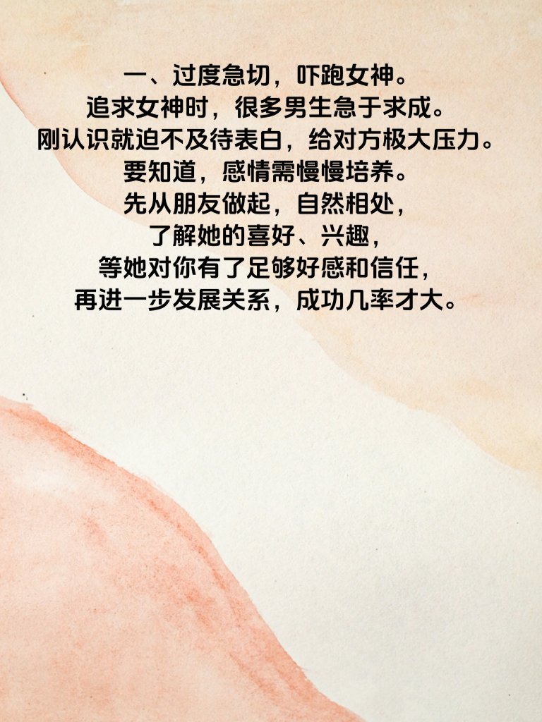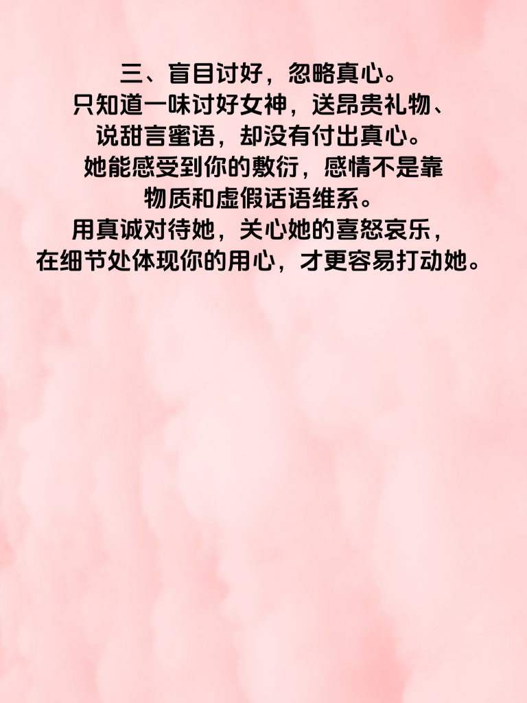 一、过度急切,吓跑女神。追求女神时,很多男生急于求成。刚认识就迫不及待表白,给对方极大压力。要知道,感情需慢慢培养。先从朋友做起,自然相处,了解她的喜好、兴趣,等她对你有了足够好感和信任,再进一步发展关系,成功几率才大。 二、毫无底线,丢失自我。为讨女神欢心,有些男生彻底失去自我。她的任何要求都无条件答应,却忘了自己的原则和想法。这样不仅会让对方看轻,还会让自己在感情里疲惫不堪。保持自我,展现真实魅力,才能吸引到真正欣赏你的人。 三、盲目讨好,忽略真心。只知道一味讨好女神,送昂贵礼物、说甜言蜜语,却没有付出真心。她能感受到你的敷衍,感情不是靠物质和虚假话语维系。用真诚对待她,关心她的喜怒哀乐,在细节处体现你的用心,才更容易打动她。