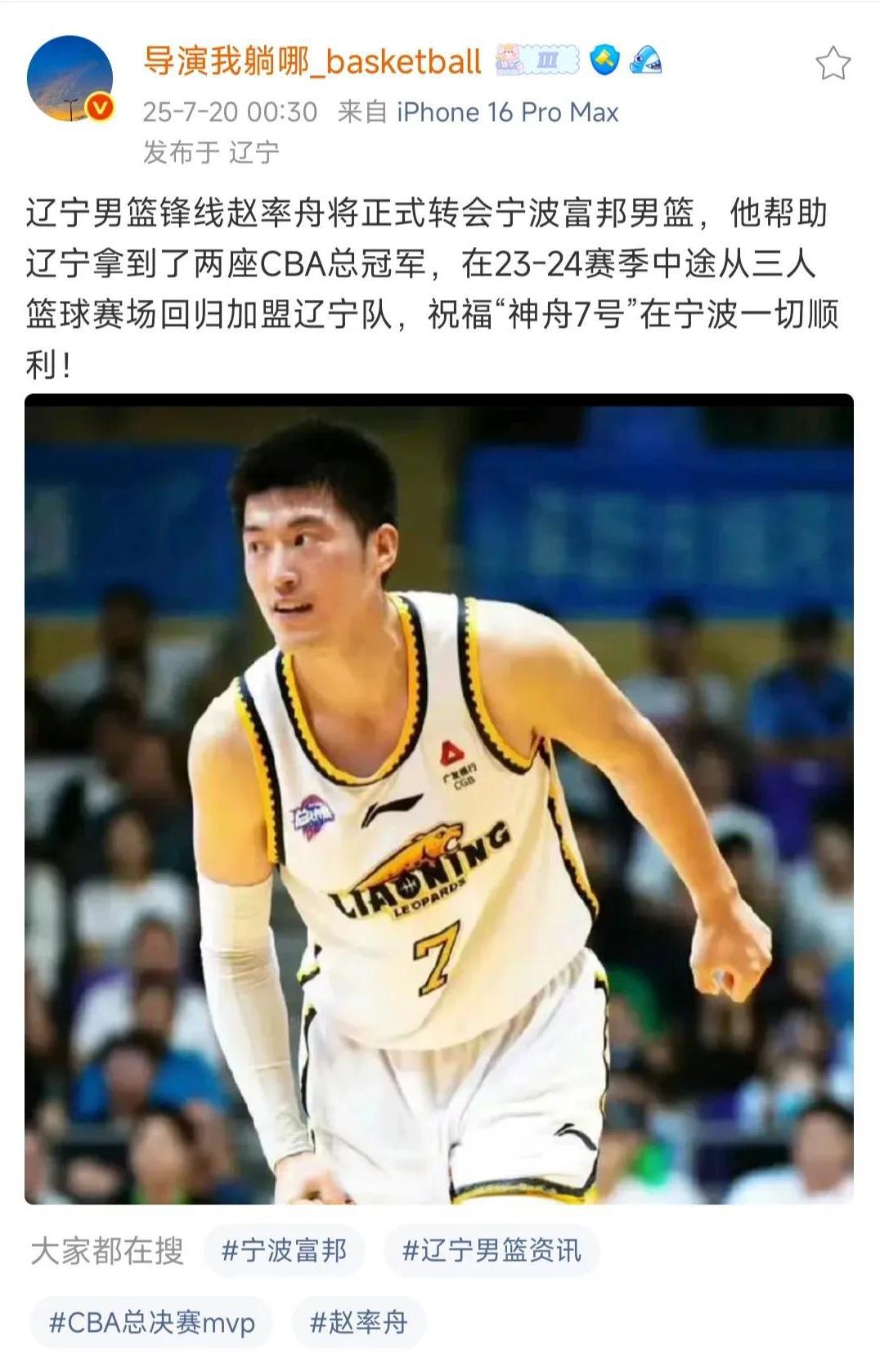 辽宁知名媒体人深夜透露两点: 一:赵率舟将正式转会宁波男篮 二:莫兰德重回辽宁男