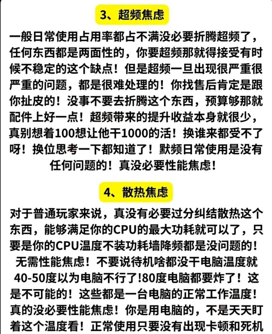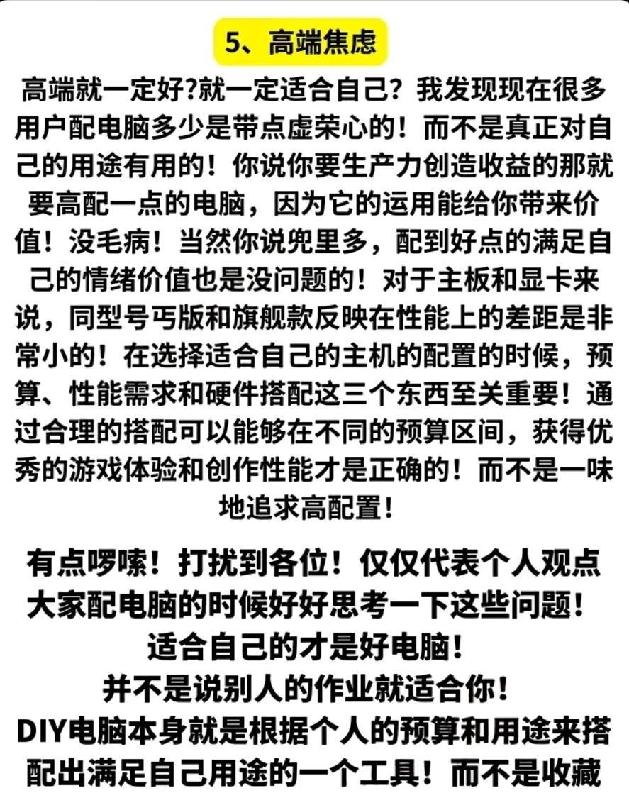 DIY电脑的五大误区!什么才是适合自己的? 电脑本身就是服务于人的一种工具,无论你是打游戏的娱乐的还是做生产力的!它都只是个工具,只是通过科技的方式来满足自己的需求!真的我遇到过较多一部分的小白太过于性能焦虑了!压根不清楚自己到底需要啥?担心这个担心那个的!说真的没必要! 目前大部分电脑都是性能过剩的,只是看个人的追求而已!你想体验更好?那是要提高预算的!你要想颜值更高?那也是要加预算的!既然想要好的,那是要付出多一点的!付出和收获都是成正比的!你想出付100的体力收获1w的收益是不存在的! 还有一个就是有电脑的觉得性能不够用卡顿更换可以理解,但是没有问题的电脑也来掺和一脚问这个电脑怎么样!既然已经入了那就没必要再去纠结这个东西,你想避雷那是要提前做好功课再选择的!既然结果已定再来后悔真没必要!好好感受当下吧!太过焦虑只会让自己不开心。