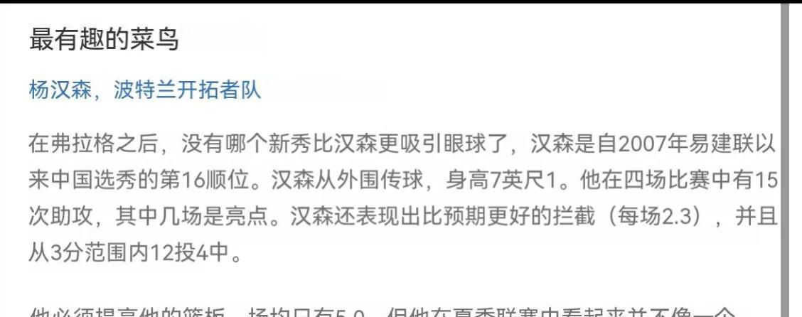 ESPN对杨瀚森的评价,ESPN还是很准确的。