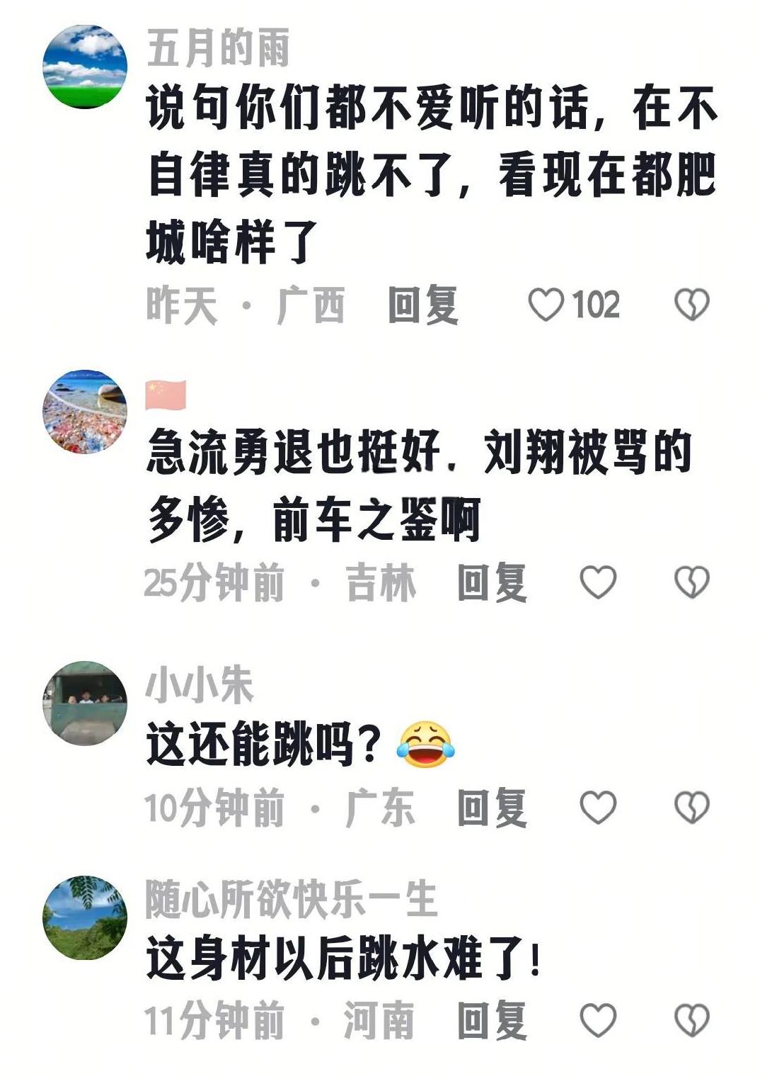 全红婵现在退役也挺好?19日晚,全红婵的师兄陈艾森分享了一条训练视频,许久不在训练场露面的全红婵也现身锻炼了,然而视频里的全红婵身材体型变化太大,引发了众多网友们的疑问“这还能跳水吗?”,更有网友表示全红婵现在退役也挺好,毕竟之前刘翔被骂的有多惨都是有目共睹! 现在全红婵的体重是她目前需要跨越的坎,她的跳水技术肯定是没问题,但她现在的身体发育,再加上遗传家里人的大体格,想要减重再回巅峰肯定难了,如果瘦不下来,退役也正常,不过看到全红婵还在训练还是挺开心的,这代表她还没有放弃,虽然会很累,但希望她一定要坚持到底,现在距离大湾区全运会开幕还有110天了,希望全红婵能卫冕冠军!