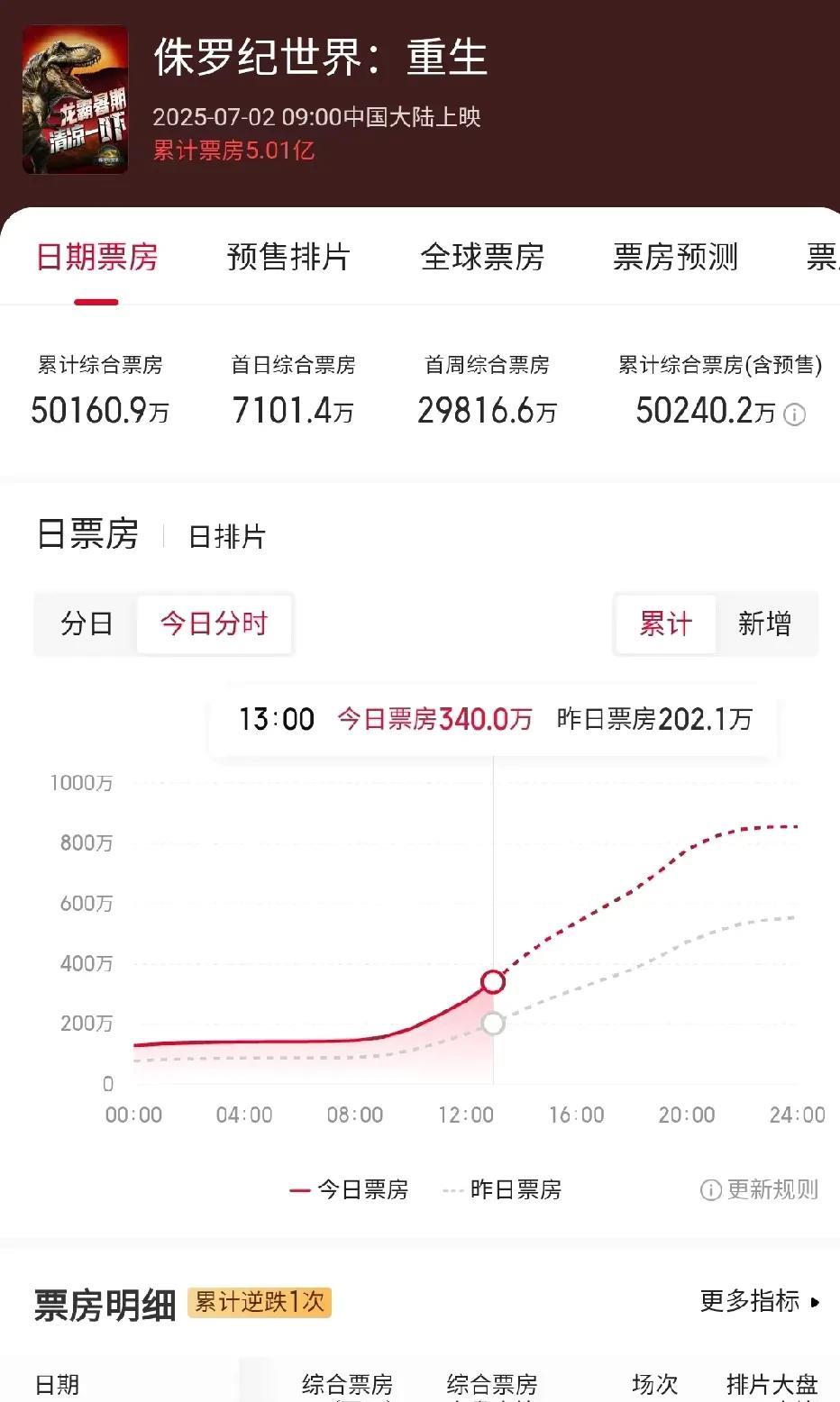 今年除了春节档《哪吒2》表现亮眼,带动大盘,近几个月市场低迷,终于有一部电影票房破5亿,不是大鹏的《长安的荔枝》,而是好莱坞的恐龙电影《侏罗纪世界》。 有些特定影片是市场需要,就像恐龙,哪怕剧情烂一点,耐不住孩子喜欢看。 而大鹏的《长安的荔枝》,上映2天,票房破1.5亿,这部电影恐怕会是近几个月,第二部破五亿电影,下一部就看国庆档。