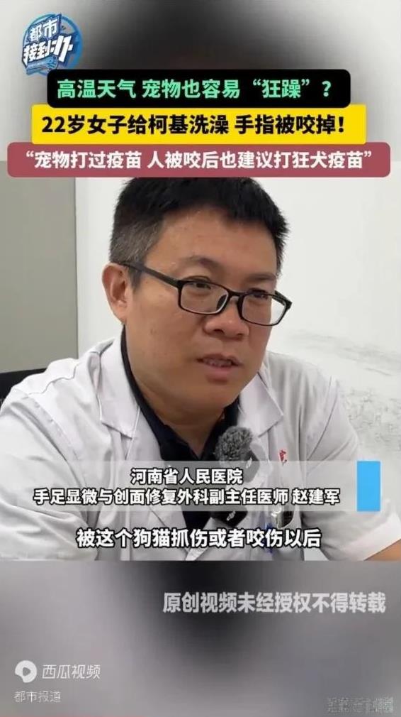 天热物燥,河南女子被柯基犬咬掉手指头。随后,在医院接上了。 22岁陈姓女子是一家