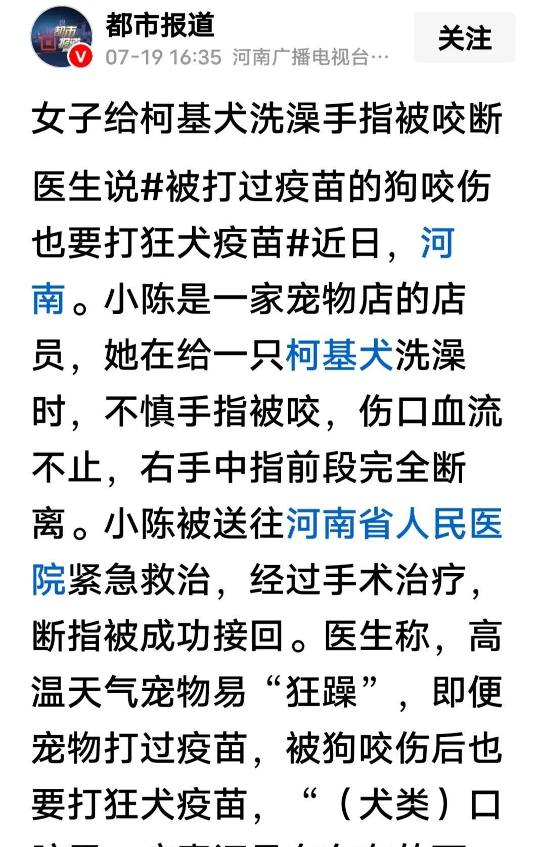 天热物燥,河南女子被柯基犬咬掉手指头。随后,在医院接上了。 22岁陈姓女子是一家宠物店护理员,她在给一只柯基犬洗澡时,狗突然狂躁起来,上去狠狠咬住她的手指头不松口,直到右手中指完全脱离为止。 大家赶紧将她送往省人民医院救治,由于时间没有耽误,陈女士断指顺利接上。 医生告诉她,“无论咬人狗有没有接种疫苗,她都要赶紧打狂犬疫苗,犬口腔含有病毒的可能。还有,高温天气,宠物容易“暴躁”,谨防被宠物咬到。 网友说,“养宠物绝非易事,它需要责任担当,若只是随性而为,缺乏对宠物习性的了解,最后受伤的可能不是他人,还有自己,应慎之又慎。” “可怜的毛孩子,这是多长时间没吃过肉了?” “畜牲终究是畜牲,没有必要把它当祖宗供着,做任何事情都不要走极端,适可而止。” “它只是个毛孩子,别跟它一样,千万别骂它!别打它!别吓着毛孩子喽!” “肯定是你惹到它了,狗狗从来不会乱咬人,毛孩子也需要被尊重。” “经常说我家狗不咬人的出来走两步!” (信息来自都市报道)