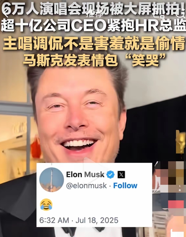 CEO演唱会上搂抱公司HR总监被直播后,两人最尴尬的不是暴露了,而是广大网友都在质疑女主太老了!因为男主的原配比三儿漂亮太多了。不得不说,这剧情超出想象,三个破笑掉大牙。就连马斯克都“笑哭了”,在男主发布的道歉声明后回复了一个“笑哭了”的表情! 近日,在酷玩乐队的波士顿演唱会上,M科技公司Astronomer的CEO,搂抱公司的HR总监。被大屏幕逮个正着,现场6万观众目睹了这对“害羞的”情侣。就连乐队主唱克里斯·马汀当时都在调侃他们“要么是太害羞,要么就是在偷Q”。事后男主还发文向妻子道歉,然而网友们扒出他的妻子社媒的时候彻底抓狂了!因为,他的妻子可比这个HR总监年轻漂亮太多了,而且他们已经有不止一个孩子了。有这么漂亮的妻子还去找个那么老的三儿,网友更不能理解了,于是对他的质疑就更猛烈了。就连马斯克都忍不住要来调侃一下了。