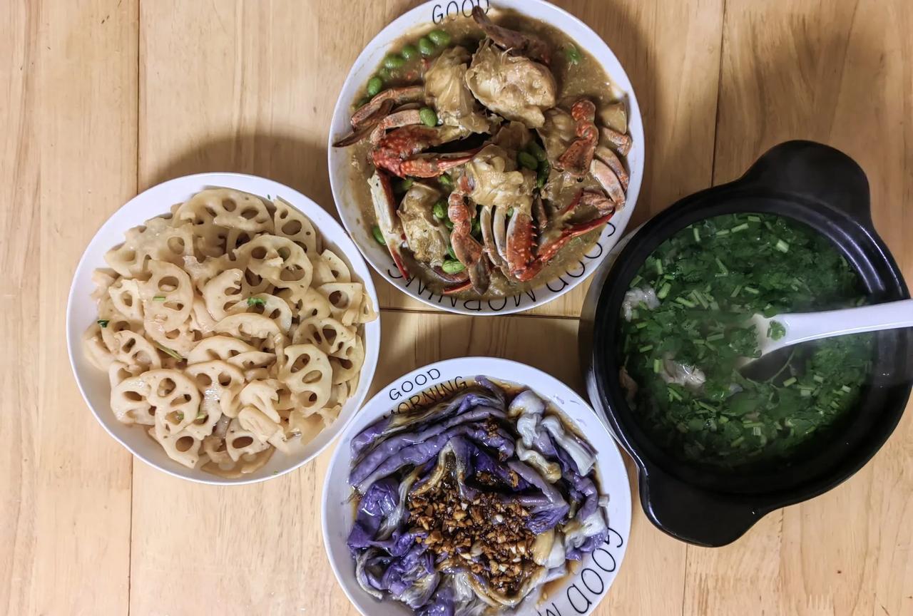 今天蓝天白云好天气,气温不低,风不小,体感爽。 吃了早餐,上午8点多去了一趟西郊百联“品上生活”清美店…顾客不少,一片热闹,琳琅满目,品种繁多,品质也不错,价格差不多吧!只要品质好,贵点也能接受。 今日午餐,牛肉粉丝汤,蒜泥蒸茄子,面拖梭子蟹,炒藕片, 我们的退休生活就是随遇而安。