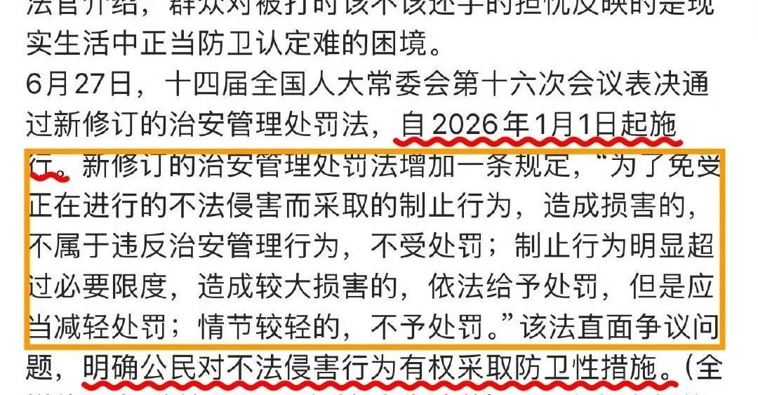 我们对凑整日子是不是有什么执念? 以前那种不问青红皂白就判定互殴的做法,表面上看似乎可以起到一些减少冲突的作用,实际上,对于那些霸凌者则是起到了保护伞的作用,反倒是束缚住自卫者的手脚。并不能真正减少违法行为的发生,实属懒政。 今年六月底,人大常委会对治安管理处罚法做出了修订,明确了公民在受到不法侵害时有权进行防卫措施。 这本是一件好事,是法治的进步。但让人不解的是,这条修订要到明年才生效。这又不涉及什么很复杂的系统技术性调整,完全可以在年内生效的,就算要凑个整日子,八月一日不行吗?九月一日不行吗?十月一日不行吗?干嘛非拖到明年呢?