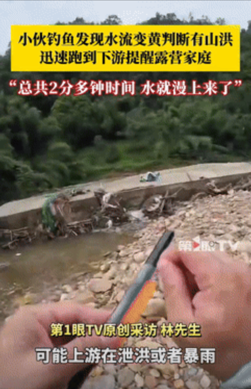 积大德了!广东肇庆,一小伙去山里钓鱼,发现溪流的水变黄,猜测可能是山洪要来,可正当他准备离开时 ,他猛地想起下游还有两户人家在野营,脚底板像抹了油似的往下游冲。等喊上人、帮着搬完东西,刚挪到安全地儿没两分钟,山洪就轰隆隆扑过来,刚才的露营地瞬间被淹,连营地车都冲得打转。 这哪是运气好?是小伙的警觉和那份“管闲事”的善良救了人。现在总有人说“少管闲事”,可真遇到事儿,往往就是这“多管的一步”能救命。野外游玩看着惬意,藏着的风险可不少,多份心眼、多句提醒,可能就躲过一场灾祸。 你户外遇到过这种“不起眼的危险信号”吗?都是怎么应对的?