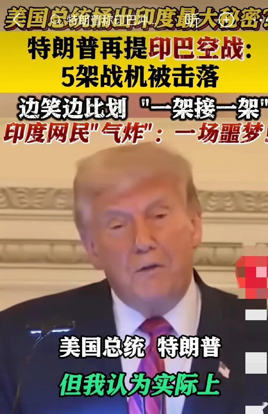 印度网友又要气炸了,破防了。 当地时间7月18日,美国总统特朗普表示,今年春季印巴冲突期间“可能有五架战机被击落”。他未明确是哪一方的飞机,但声称“飞机确实被打下来了,四五架,我认为是五架”。 特朗普真是个老狐狸啊,点到为止,不明说是印度方战机被击落。估计,是为了和印度贸易谈判时当筹码拿捏印度啊。 有时候,不服特朗普不行,他可从不藏着掖着,大嘴巴有时候真的会撕开遮羞布。 不知道万能的印度网友还能找出什么样的借口来掩饰? 不知道印吹们作何感想?