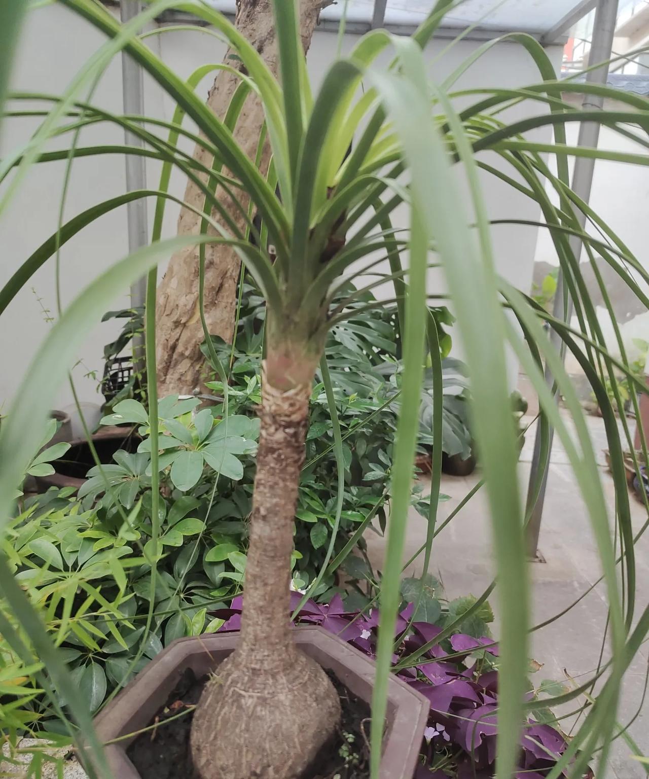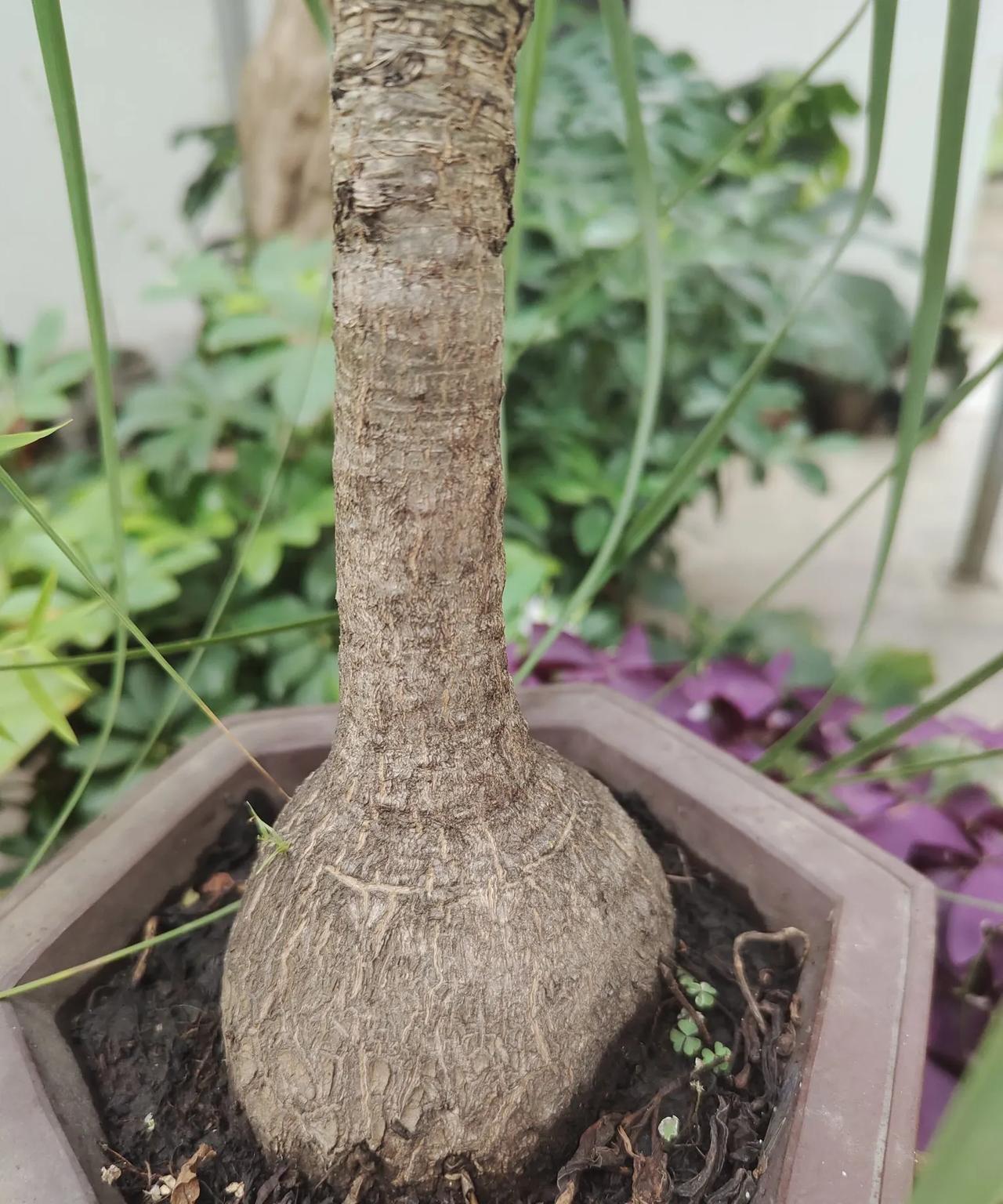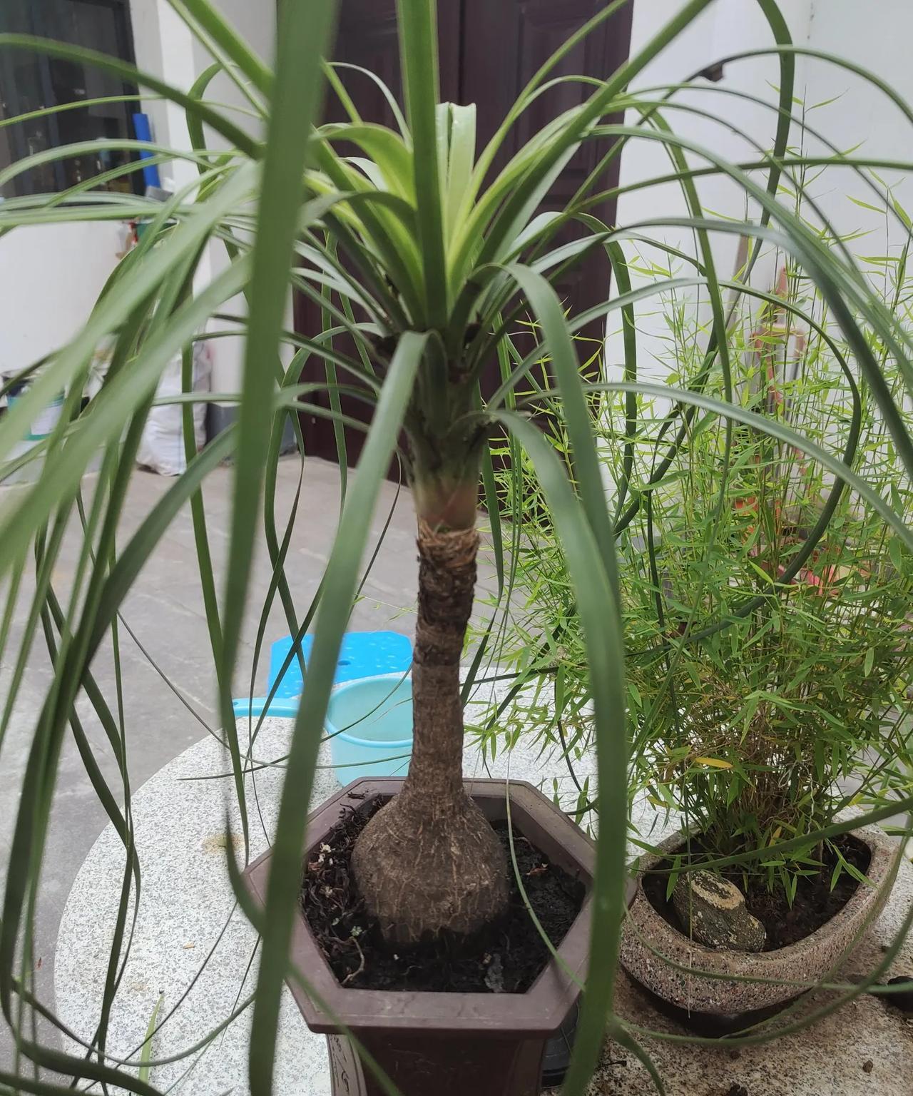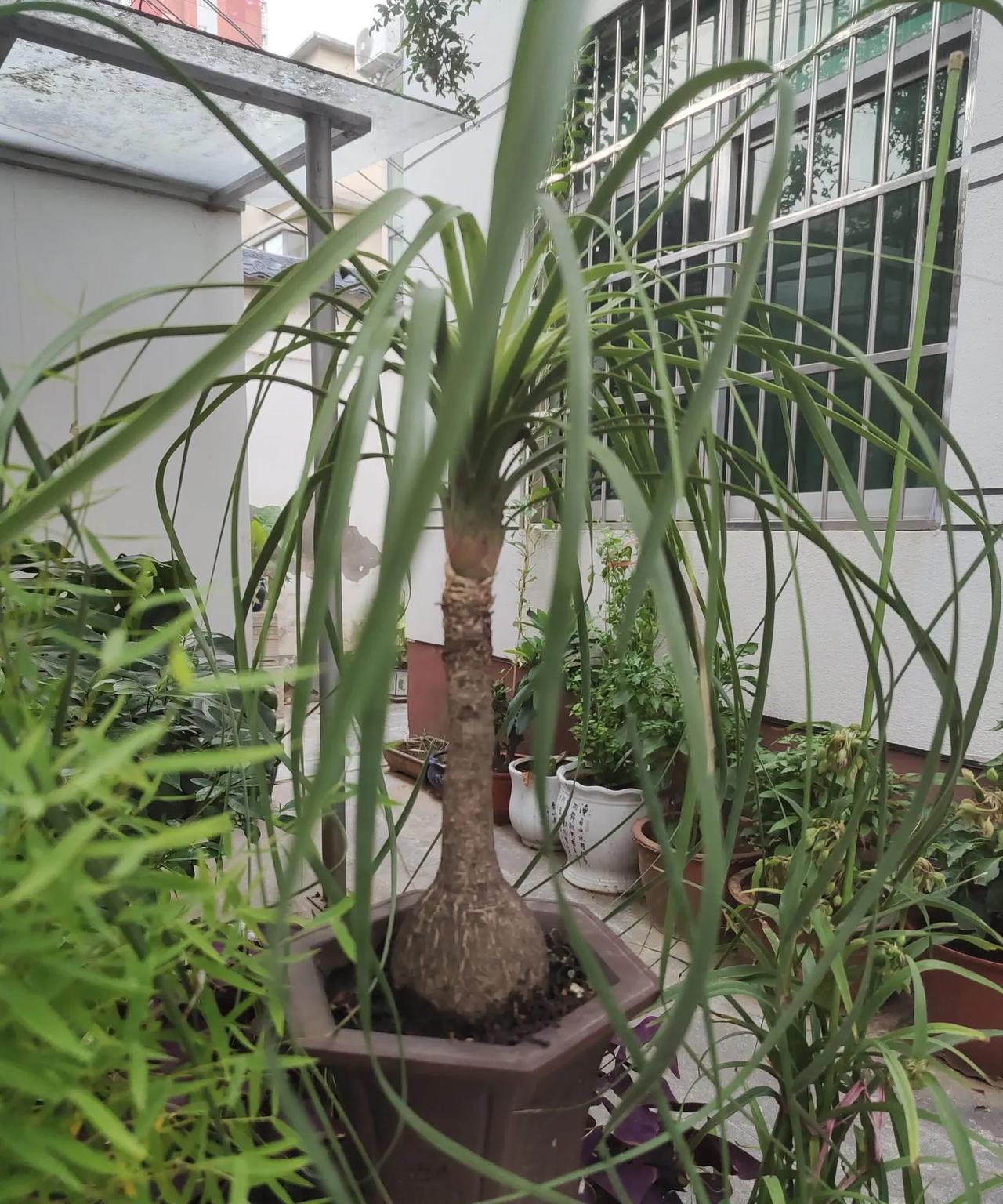 这盆酒瓶兰养了十三年了,从小小的一株长到这么大,可真慢啊。这家伙真耐旱,也没给它换过土,偶尔浇点水,它就活得那么肆意,头发辫子垂的有三尺长,风一吹随风摆动,还挺美的。这个盆有点小了,快容不下这个大肚子酒瓶了,想给它换换盆吧,又怕把它换死了,算了,不管它了,就让它这样活着吧。