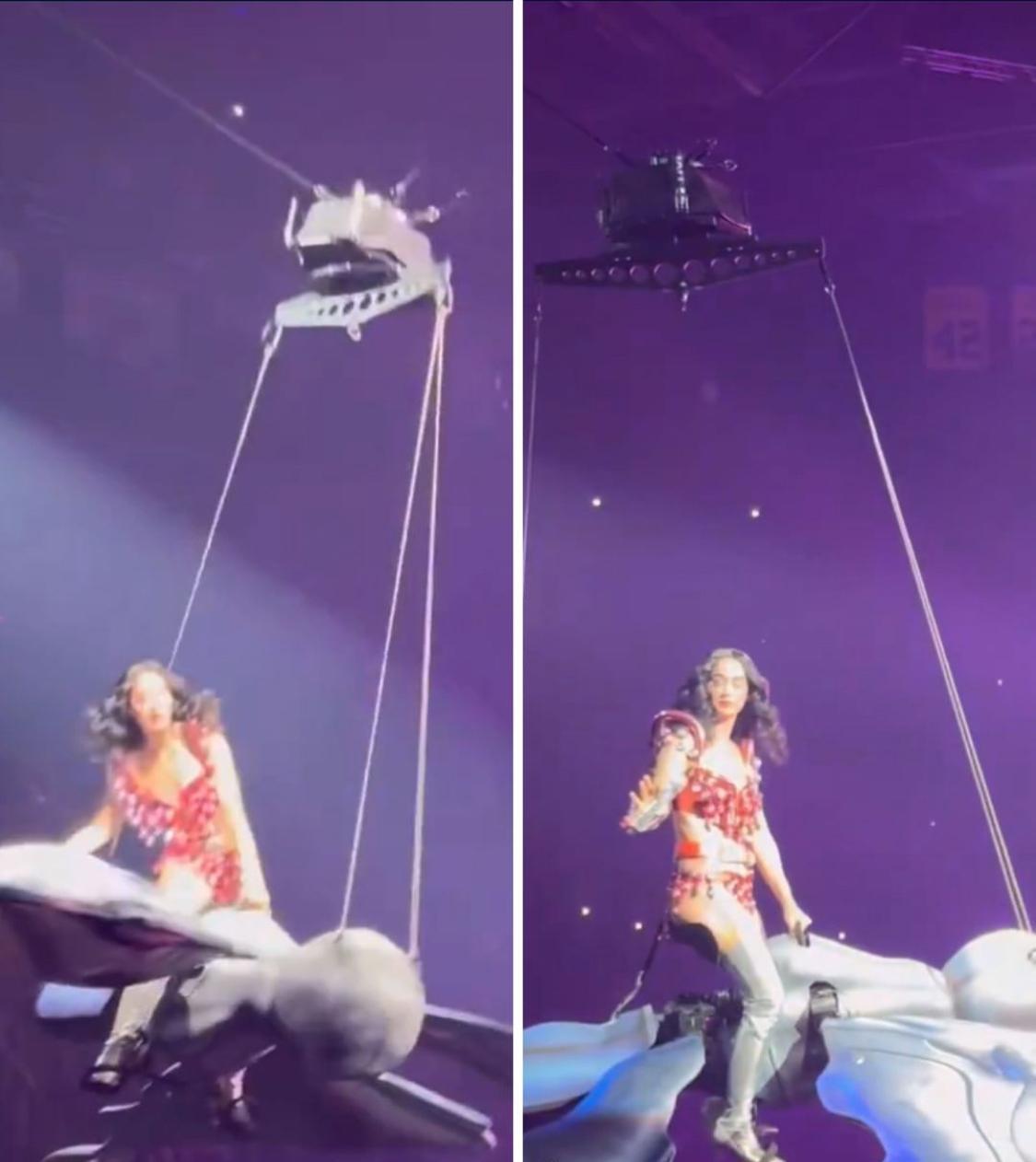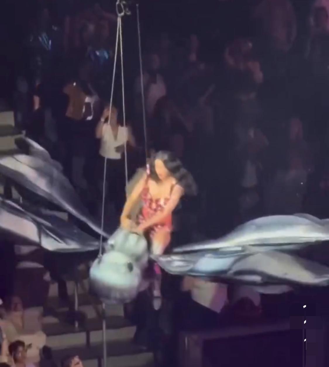 水果姐凯蒂·佩里周五在旧金山演唱会表演《老虎之眼》时,所乘巨型蝴蝶飞行道具突发故