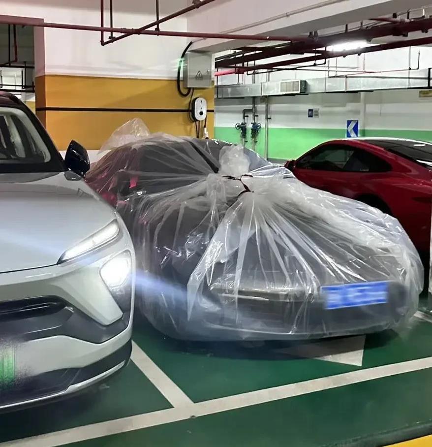 主要是奇怪怎么放进去的。应该是先把袋子铺车位上,再倒进去包起来。