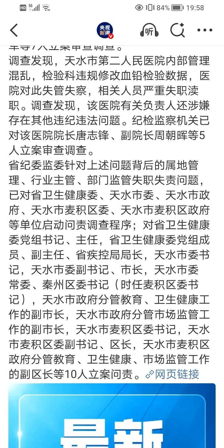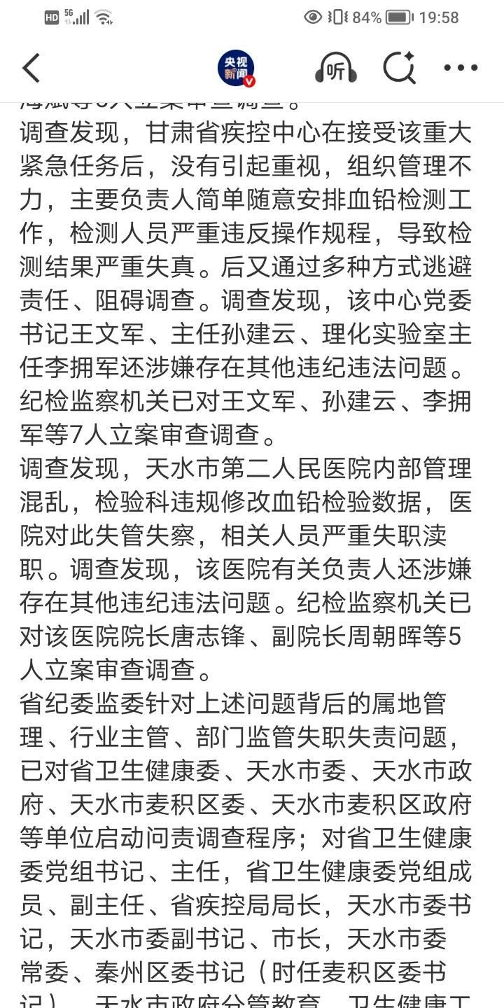 关于甘肃幼儿血铅追责问责情况!差不多把天水官场给翻了一个底朝天! 消息来源:央视