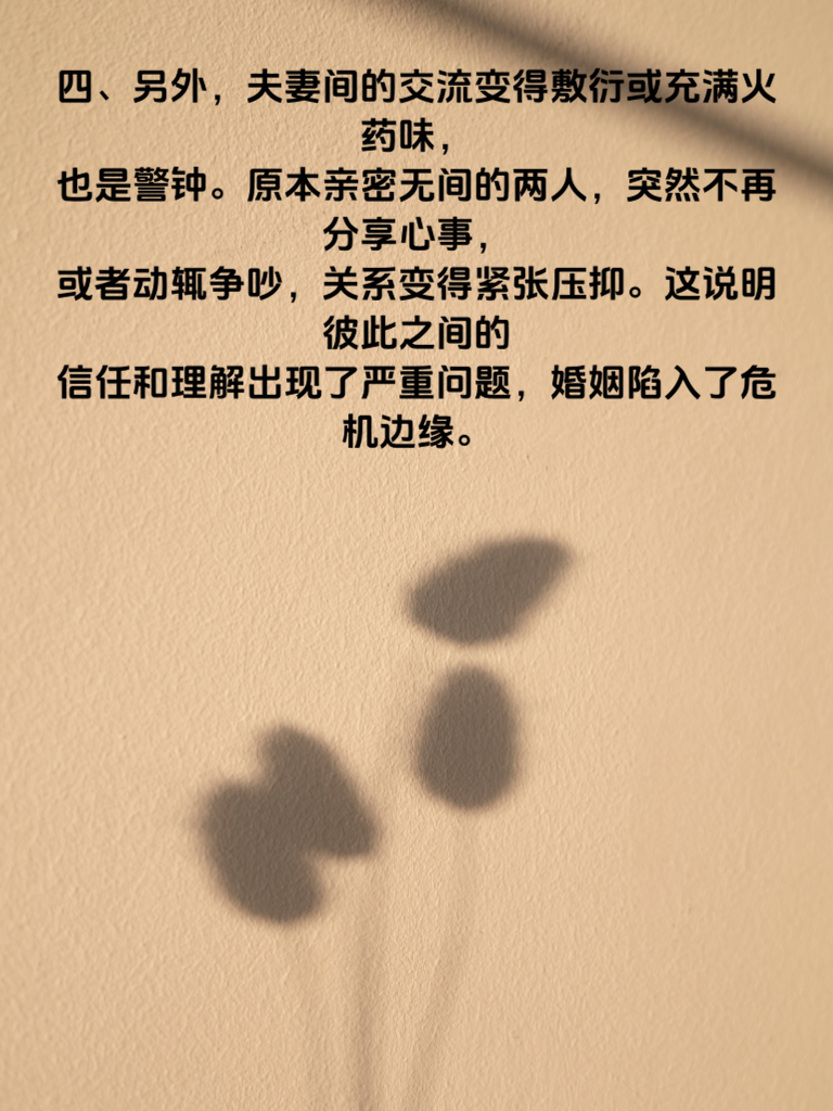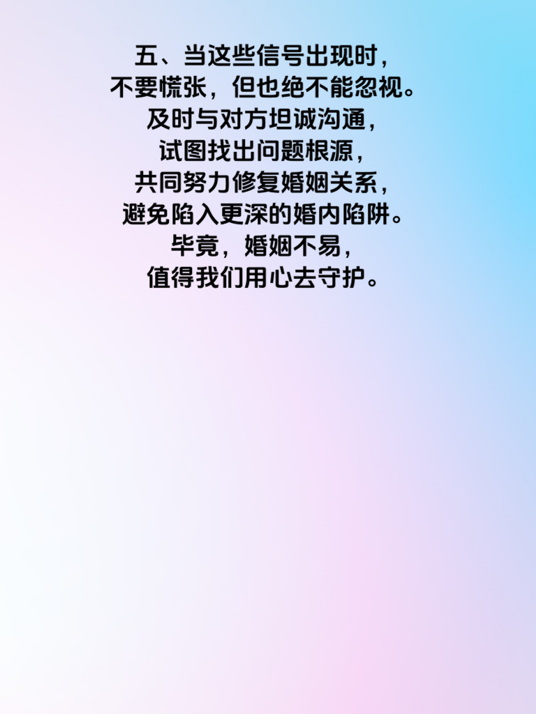 一、婚姻,本应是爱的港湾,却也可能暗藏陷阱。在婚姻生活中,有些信号一旦出现,就需要我们格外警惕。 二、首先,留意对方突然的财务变动。如果另一半莫名地开始隐瞒收入、频繁进行大额支出,或者对家庭财务状况遮遮掩掩,这可能是个危险信号。也许他或她正在为某些不可告人的事情筹备资金,这背后说不定隐藏着背叛或其他不良企图。 三、再者,关注对方的行踪变化。经常晚归且理由牵强,或者对自己的日常行程含糊其辞,甚至开始有一些神秘的社交活动,都值得深思。这可能意味着他们在婚姻之外有了新的情感纠葛,正在逐渐远离婚姻的轨道。 四、另外,夫妻间的交流变得敷衍或充满火药味也是警钟。原本亲密无间的两人,突然不再分享心事,或者动辄争吵,关系变得紧张压抑。这说明彼此之间的信任和理解出现了严重问题,婚姻陷入了危机边缘。 五、当这些信号出现时,不要慌张,但也绝不能忽视。及时与对方坦诚沟通,试图找出问题根源,共同努力修复婚姻关系,避免陷入更深的婚内陷阱。毕竟,婚姻不易,值得我们用心去守护。