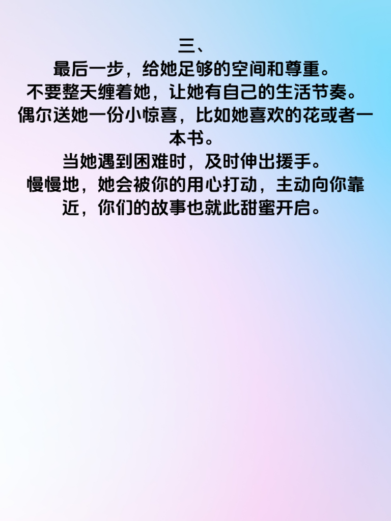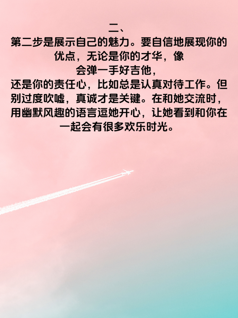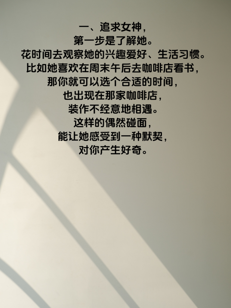 一、追求女神,第一步是了解她。花时间去观察她的兴趣爱好、生活习惯。比如她喜欢在周末午后去咖啡店看书,那你就可以选个合适的时间,也出现在那家咖啡店,装作不经意地相遇。这样的偶然碰面,能让她感受到一种默契,对你产生好奇。 二、第二步是展示自己的魅力。要自信地展现你的优点,无论是你的才华,像会弹一手好吉他,还是你的责任心,比如总是认真对待工作。但别过度吹嘘,真诚才是关键。在和她交流时,用幽默风趣的语言逗她开心,让她看到和你在一起会有很多欢乐时光。 三、最后一步,给她足够的空间和尊重。不要整天缠着她,让她有自己的生活节奏。偶尔送她一份小惊喜,比如她喜欢的花或者一本书。当她遇到困难时,及时伸出援手。慢慢地,她会被你的用心打动,主动向你靠近,你们的故事也就此甜蜜开启。