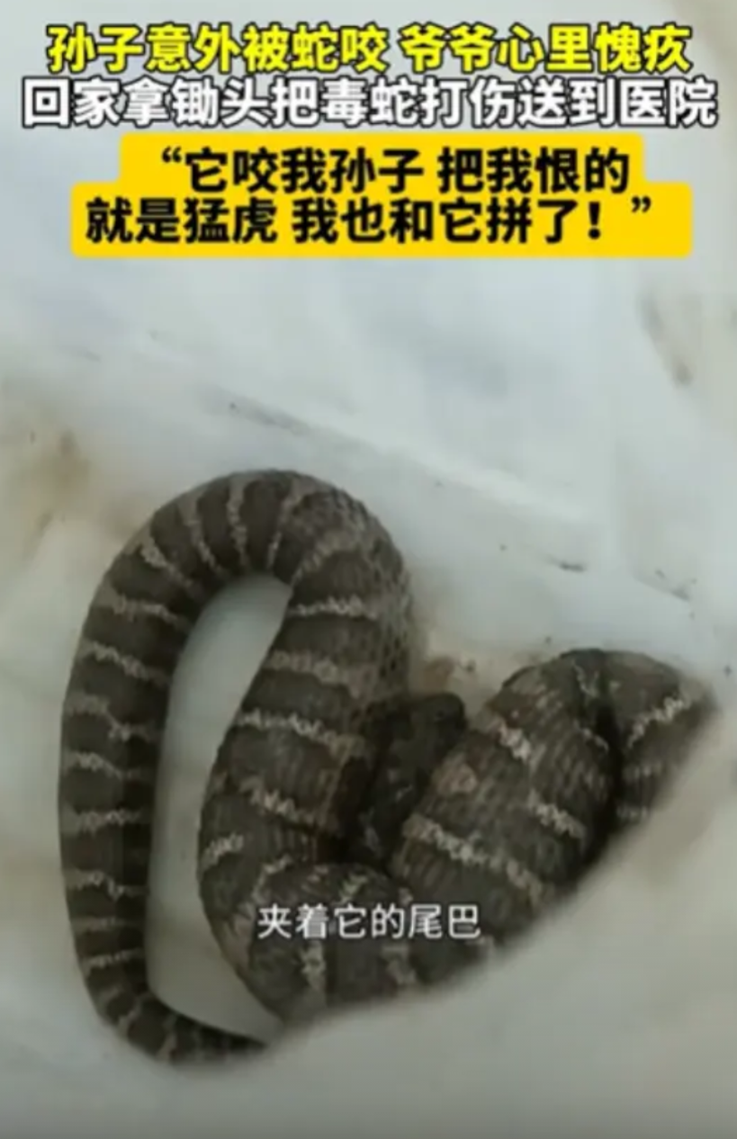 在事发地点附近,一条灰褐色的毒蛇正缓缓游动,看到这条夺走孙子健康的凶手爷爷心中的怒火彻底爆发了,尽管平日里见到蛇都会绕道走但此刻的他毫无畏惧。