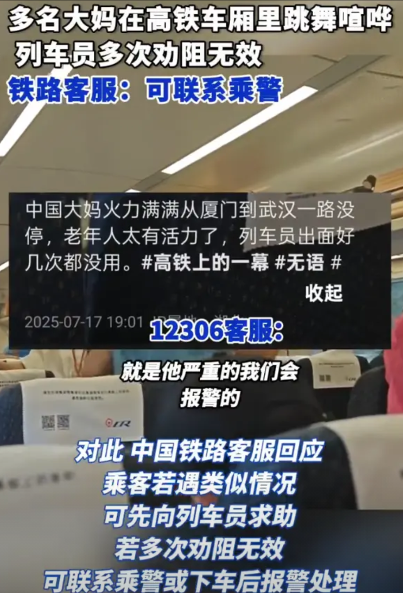 更让人震惊的是,这场"车厢舞会"竟然贯穿了从厦门到武汉的整个行程,据多位乘客透露在长达数小时的旅途中,大妈们几乎没有停歇。