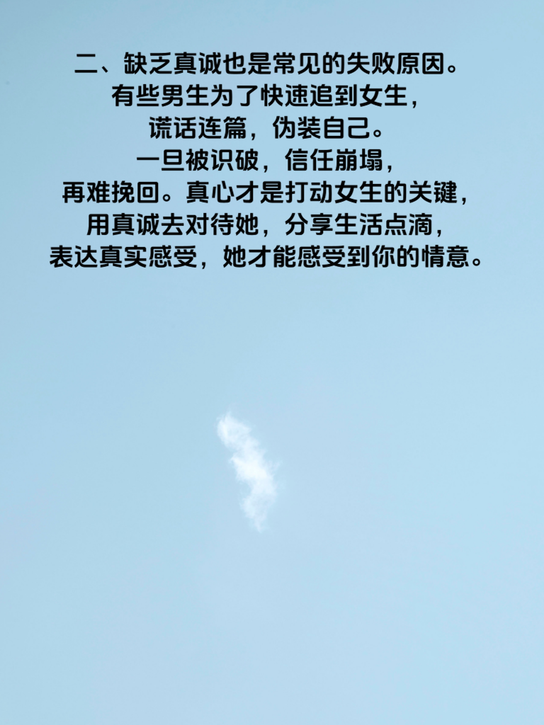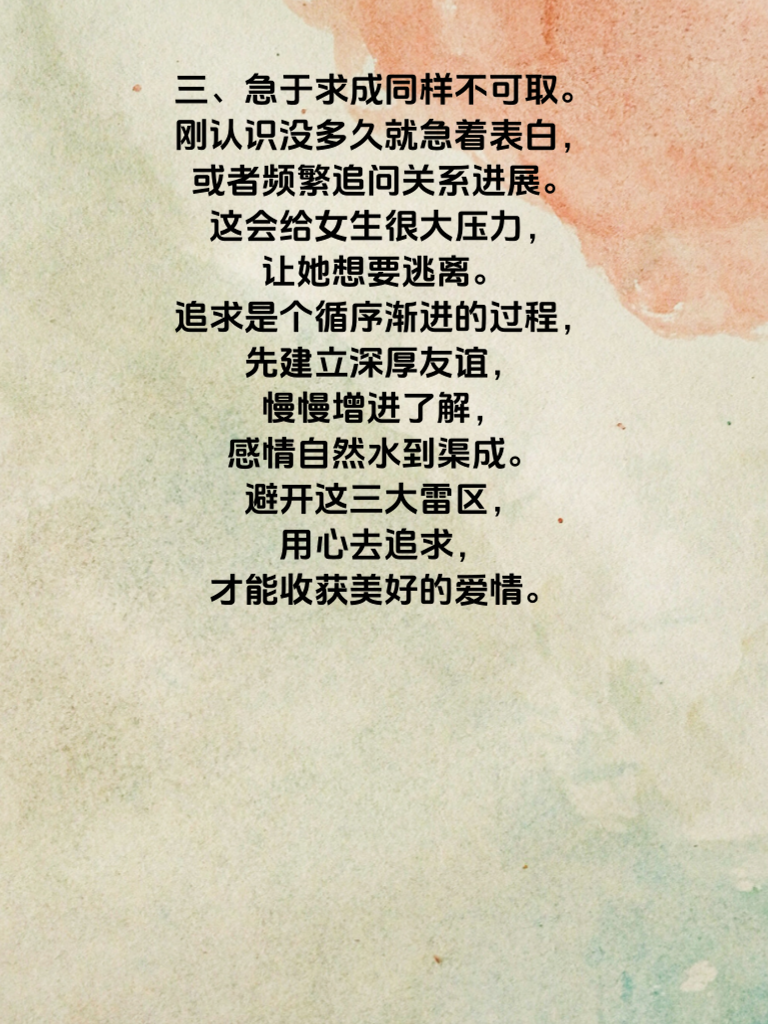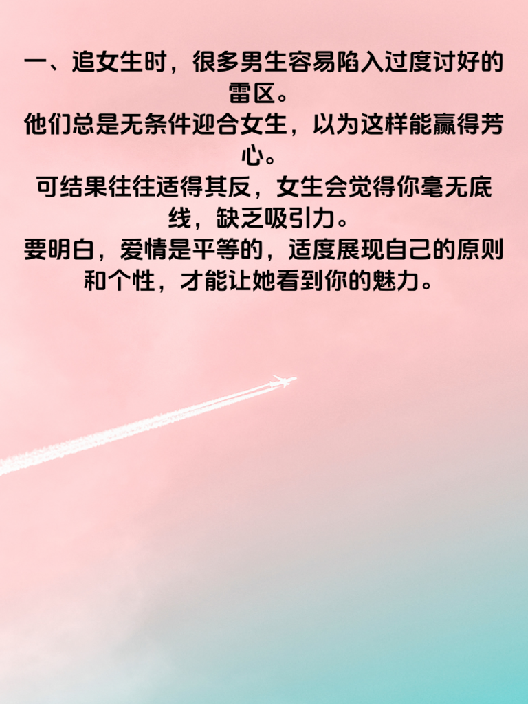 一、追女生时,很多男生容易陷入过度讨好的雷区。他们总是无条件迎合女生,以为这样能赢得芳心。可结果往往适得其反,女生会觉得你毫无底线,缺乏吸引力。要明白,爱情是平等的,适度展现自己的原则和个性,才能让她看到你的魅力。 二、缺乏真诚也是常见的失败原因。有些男生为了快速追到女生,谎话连篇,伪装自己。一旦被识破,信任崩塌,再难挽回。真心才是打动女生的关键,用真诚去对待她,分享生活点滴,表达真实感受,她才能感受到你的情意。 三、急于求成同样不可取。刚认识没多久就急着表白,或者频繁追问关系进展。这会给女生很大压力,让她想要逃离。追求是个循序渐进的过程,先建立深厚友谊,慢慢增进了解,感情自然水到渠成。避开这三大雷区,用心去追求,才能收获美好的爱情。