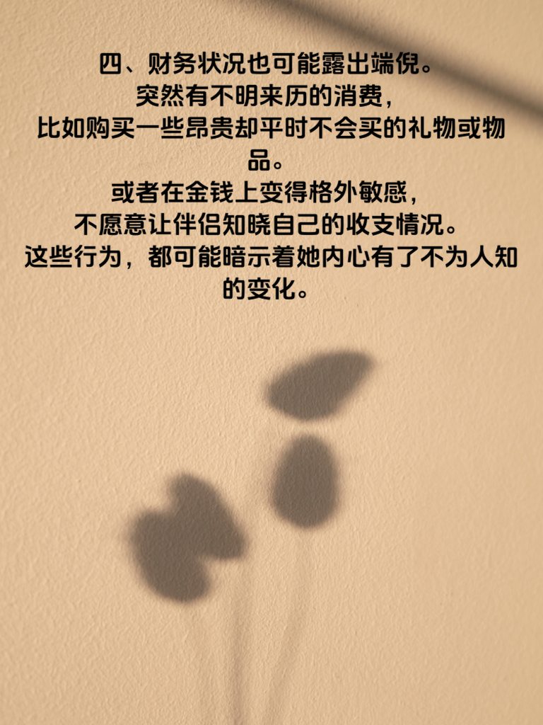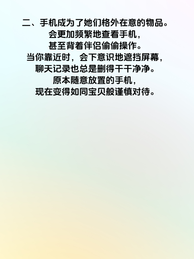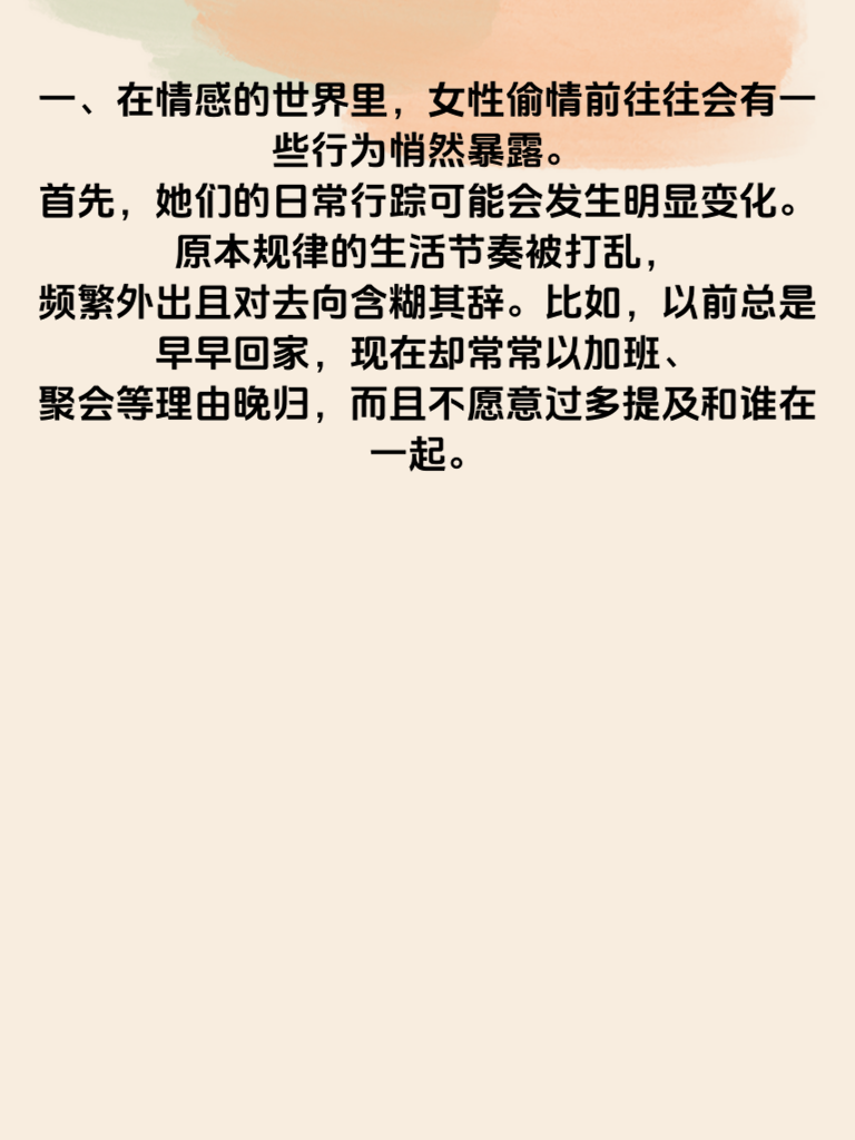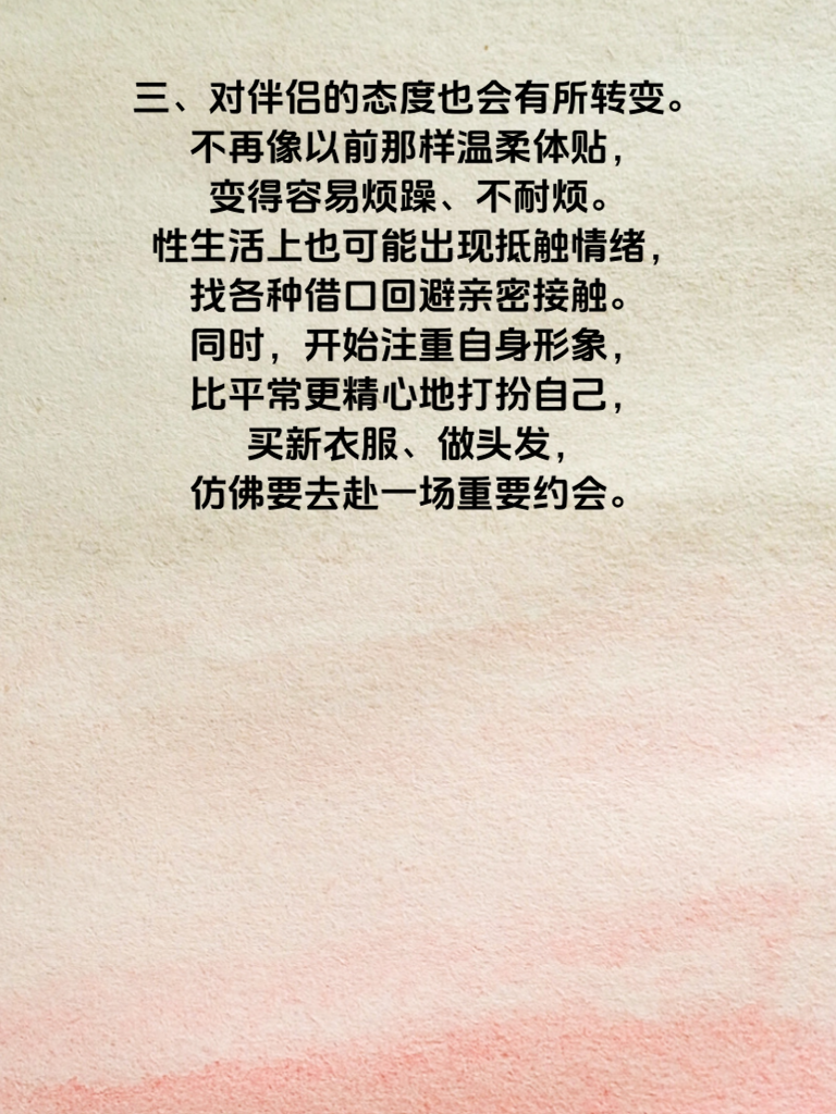 一、在情感的世界里,女性偷情前往往会有一些行为悄然暴露。首先,她们的日常行踪可能会发生明显变化。原本规律的生活节奏被打乱,频繁外出且对去向含糊其辞。比如,以前总是早早回家,现在却常常以加班、聚会等理由晚归,而且不愿意过多提及和谁在一起。 二、手机成为了她们格外在意的物品。会更加频繁地查看手机,甚至背着伴侣偷偷操作。当你靠近时,会下意识地遮挡屏幕,聊天记录也总是删得干干净净。原本随意放置的手机,现在变得如同宝贝般谨慎对待。 三、对伴侣的态度也会有所转变。不再像以前那样温柔体贴,变得容易烦躁、不耐烦。性生活上也可能出现抵触情绪,找各种借口回避亲密接触。同时,开始注重自身形象,比平常更精心地打扮自己,买新衣服、做头发,仿佛要去赴一场重要约会。 四、财务状况也可能露出端倪。突然有不明来历的消费,比如购买一些昂贵却平时不会买的礼物或物品。或者在金钱上变得格外敏感,不愿意让伴侣知晓自己的收支情况。这些行为,都可能暗示着她内心有了不为人知的变化。