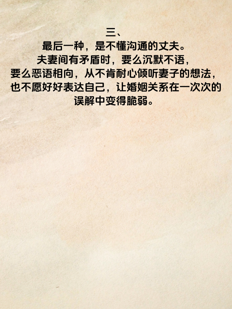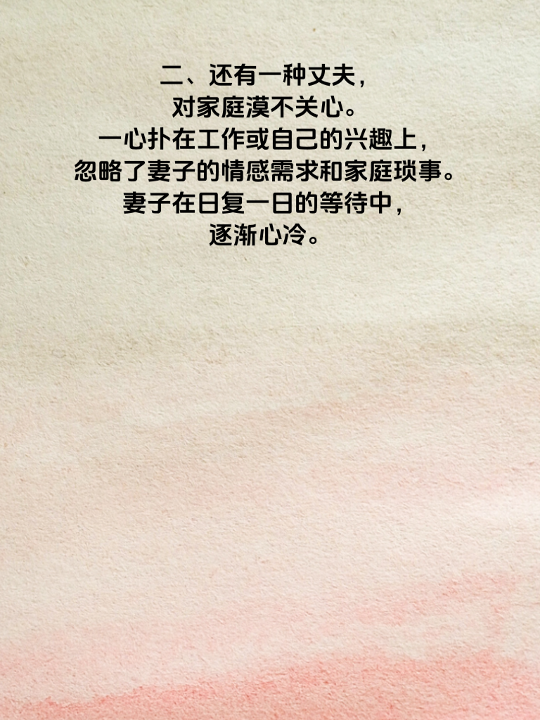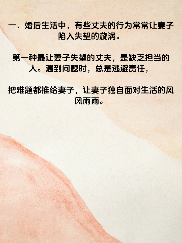一、婚后生活中,有些丈夫的行为常常让妻子陷入失望的漩涡。第一种最让妻子失望的丈夫,是缺乏担当的人。遇到问题时,总是逃避责任,把难题都推给妻子,让妻子独自面对生活的风风雨雨。 二、还有一种丈夫,对家庭漠不关心。一心扑在工作或自己的兴趣上,忽略了妻子的情感需求和家庭琐事。妻子在日复一日的等待中,逐渐心冷。 三、最后一种,是不懂沟通的丈夫。夫妻间有矛盾时,要么沉默不语,要么恶语相向,从不肯耐心倾听妻子的想法,也不愿好好表达自己,让婚姻关系在一次次的误解中变得脆弱。