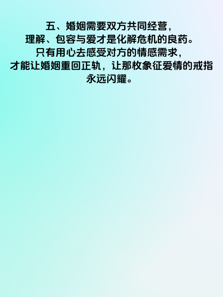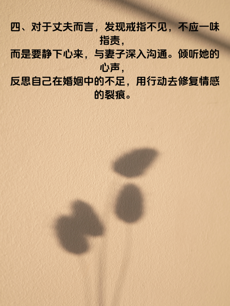 一、婚姻,本应是两颗心坦诚相对的旅程,可有时,一个小小的举动却能掀起情感的波澜。妻子悄悄藏起结婚戒指,这背后或许藏着许多复杂的情感密码。 二、也许,这是对婚姻现状不满的无声抗议。当生活的琐碎磨平了激情,当夫妻间的沟通出现障碍,她可能会通过藏戒指来引起丈夫的注意,渴望被理解、被关心。 三、又或许,这是内心缺乏安全感的体现。曾经以为的永恒承诺,在现实中遭遇挑战,她试图用藏戒指的方式,抓住那一丝尚存的安全感。 四、对于丈夫而言,发现戒指不见,不应一味指责,而是要静下心来,与妻子深入沟通。倾听她的心声,反思自己在婚姻中的不足,用行动去修复情感的裂痕。 五、婚姻需要双方共同经营,理解、包容与爱才是化解危机的良药。只有用心去感受对方的情感需求,才能让婚姻重回正轨,让那枚象征爱情的戒指永远闪耀。