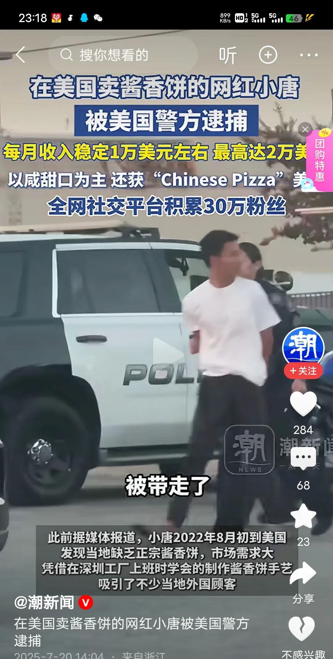在美国卖酱香饼一个月稳定收入1万美元,网红小唐被抓了。 小唐是2022年8月份去