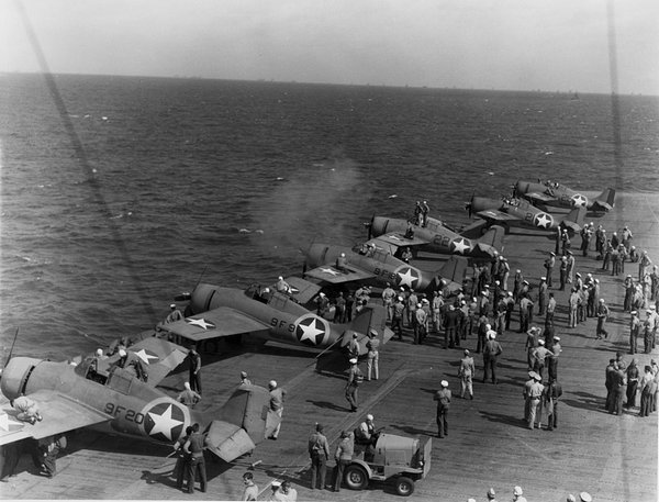 美国海军突击者号航空母舰(USS Ranger CV-4 )搭载的VF-9和VF-41中队的F4F-4野猫战斗机,在航母甲板上测试机枪,摄于1942年11月初。当时他们正在赶往北非的路上,准备参加在法属阿尔及利亚和摩洛哥登陆的火炬行动。 看来航母上因为甲板面积有限,战斗机武器测试和陆地上还是有区别。陆地上会在一定距离设个靶子,把飞机枪炮弹道设定在靶心上交汇,航母上怕是只能测试一下打不打得响。