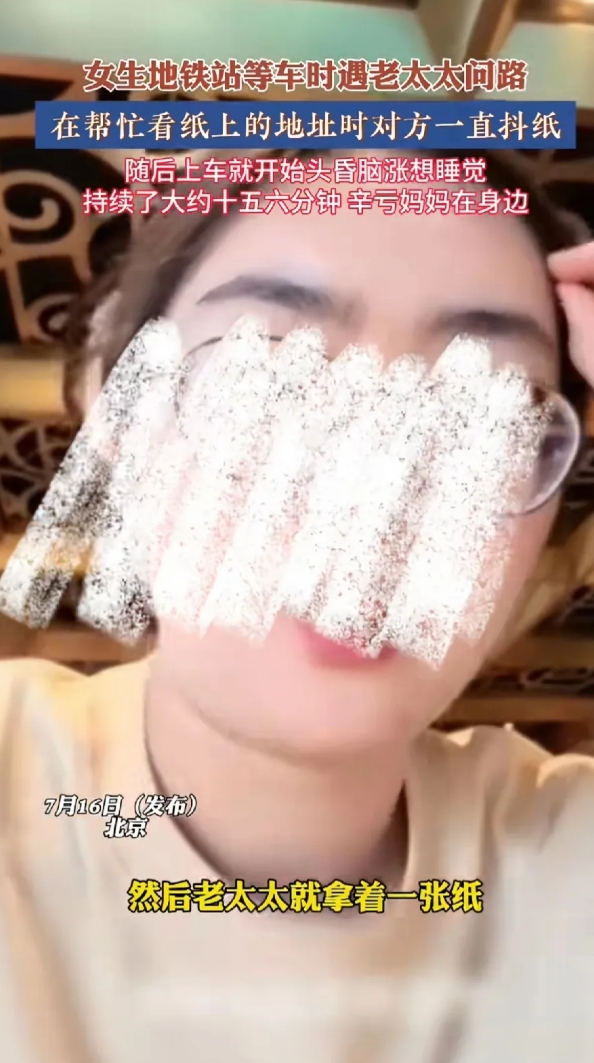 女子出门在外一定要注意保护自己,坏人无处不在,北京一女子讲述了自己经历的一件可怕的事情,她和自己的妈妈在地铁站等车,一老太太拿一张纸过来,她让女子帮她看看坐得方向对不对,但是,问路就问路,老太太却一直抖着那张纸,年轻女子根本没有反应过来,后来是女子的妈妈看不下去了,她把女子喊走了。 奇怪的事情发生了,女子上车后脑袋就开始疼,头晕,眼神都涣散的那种感觉,有一段时间自己几乎没有什么意识,感觉特别困,想闭着眼睛睡觉,大概持续了十五六分钟。 女子现在想想都后怕,如果当天不是妈妈陪着自己,自己还不知道会遇到什么事情,因为,问路的老太太也上了那趟地铁,所以,这件事听起来就很吓人,女子是一阵阵后怕啊!