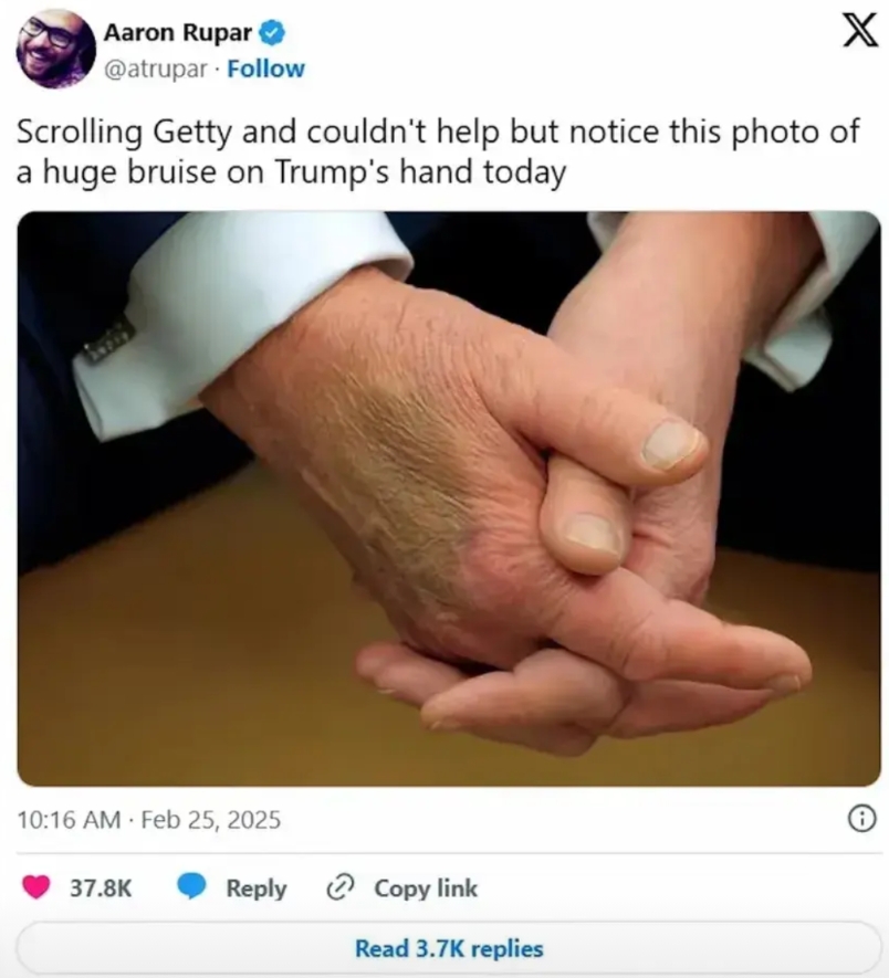 注意看,特朗普状态一点都不好,他的脚肿了,手背也青了!这些症状在我爷爷最后那两年身上见到过!老一辈说“男怕肿腿,女怕肿头”,都不是好现象! 搞不清楚为什么有些人为了权利可不断的蹦哒,明明体力不济了也无所谓? 权利真的有那么重要?钱真的有那么重要?又带不走!