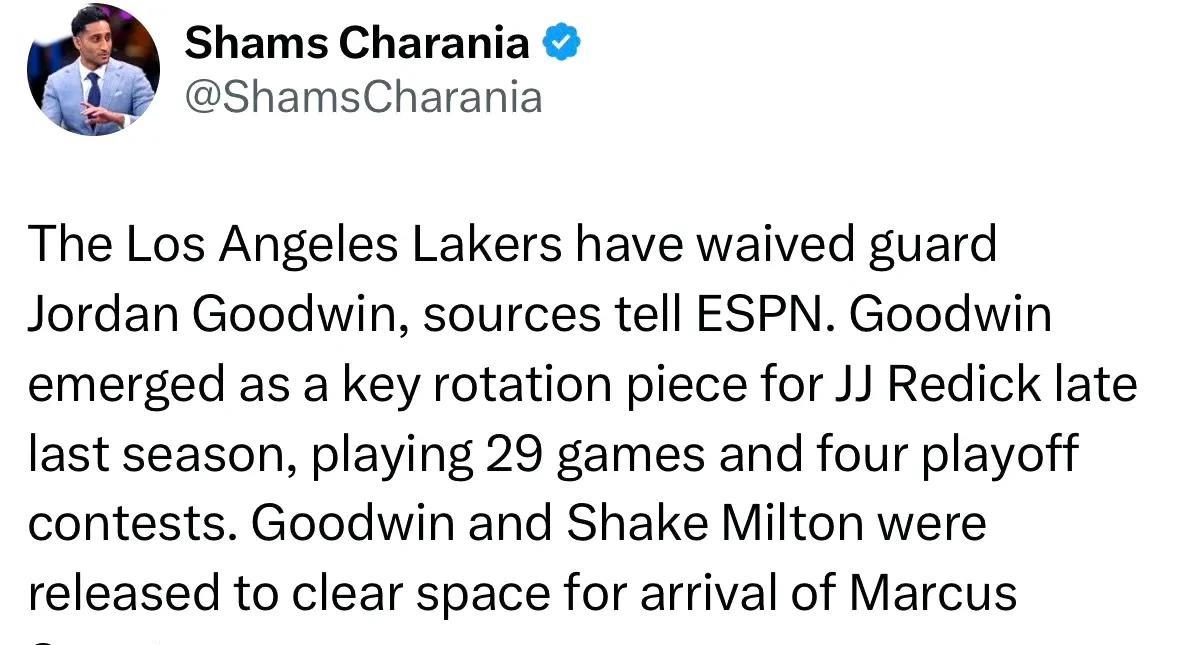 湖人队无奈的选择! 据权威记者Shams报道:湖人队将裁掉古德温,上赛季效力湖人