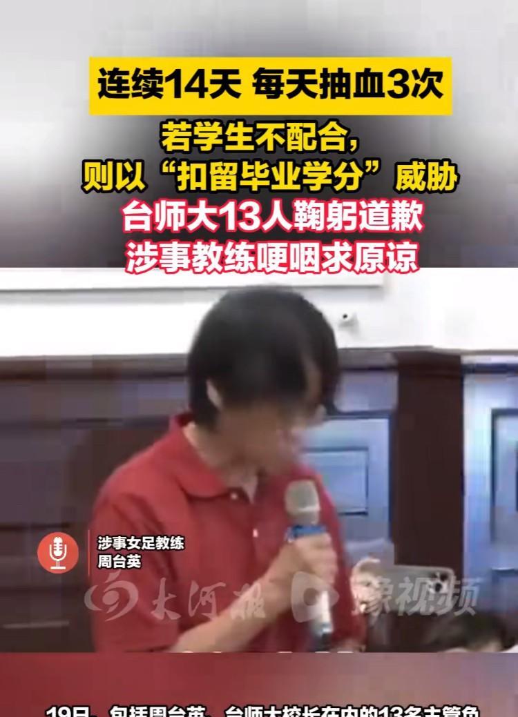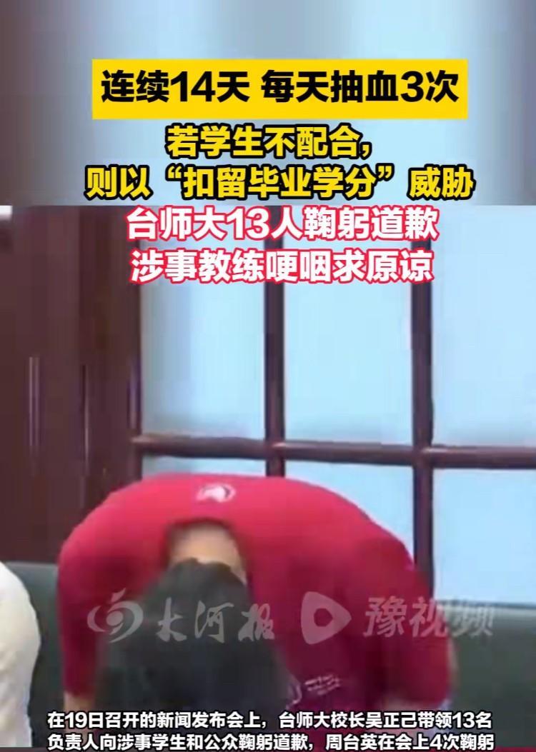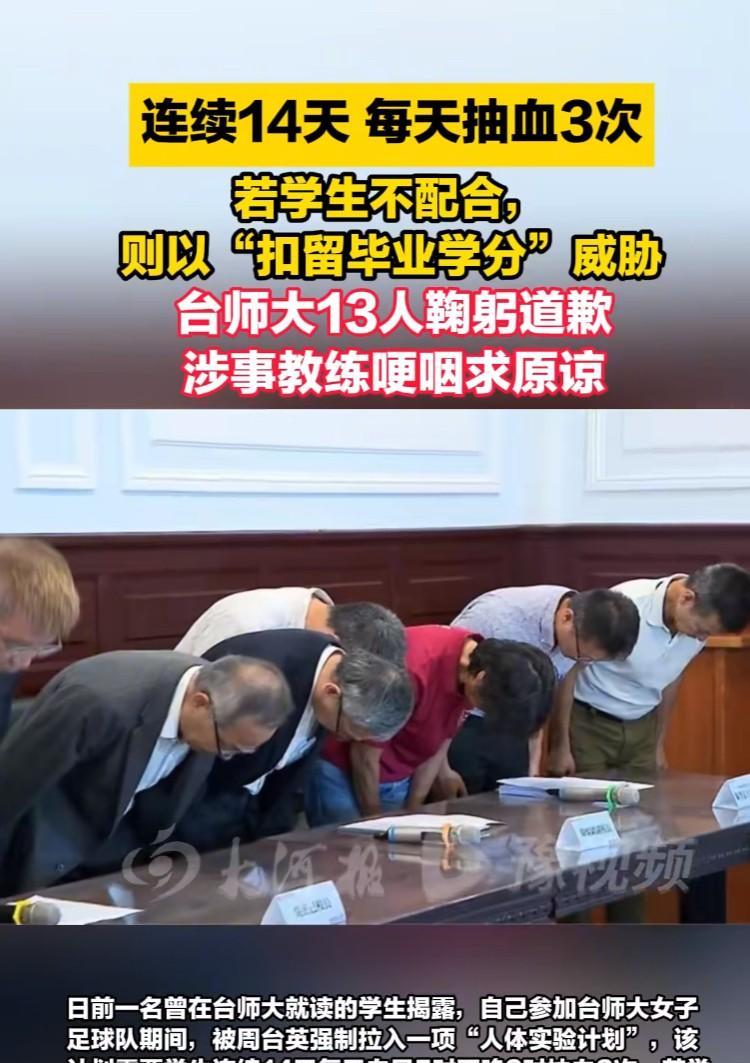 “鞠躬已经不错了 有些人鞠躬都不给你鞠还嘴硬” 台湾师大女足教练被曝常年强迫学生抽血换学分,“14天,1天3次,不抽不能毕业”, 之前就有女足队员曝光过这件事,但学校一直不了了之,直到今年的7月,该教练被再次指控,从2017年起就以不抽血不给毕业为要挟,要求学生签自愿书。然后参与实验,每天抽3次血抽满14天,被迫抽了200管血来换取那可怜的32个必修学分! 19日台师大校长带领13位涉事教师教练员召开发布会,并集体鞠躬道歉,哭求原谅!而且表示已经开除涉事教练,学校被下达行政处罚并且整改! 这样的领导根本不把学生的生命当一回事,出了问题就假心假意,假仁假义,一句弯腰,一句道歉了之。 所以坚决不能一个鞠躬道歉轻描淡写的就了事,必须严查给学生们和家长一个交代! 现在的我对于学校每次下发的免费体检的那些告知书,只要是需要抽血化验什么的,我是统统签字“不同意”谁劝也没用,孩子只有一个,有问题我自己会带她去看!