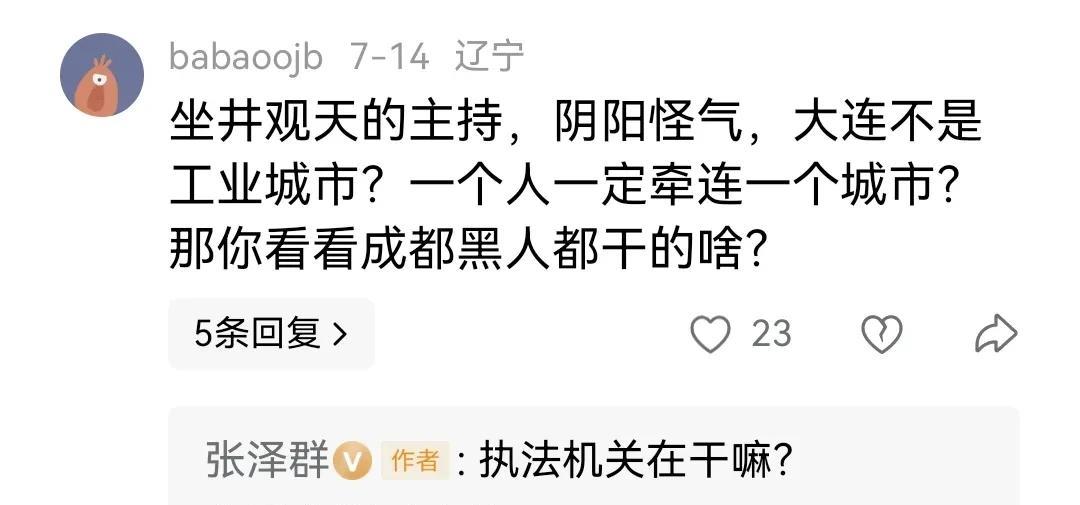 我们都知道张泽群是央视主持人,也看过他的节目,但并不意味着我们同意他的观点。 因为反对大连工业大学的处理决定,张泽群直接发帖攻击该大学,并连带上了大连这座城市。 如果仅仅如此,这是他个人观点,我们除了不敢苟同外,也无可指责。 但张泽群在评论区的相关言论,却令人大开眼界。 面对网友指责,他直接开黄腔辱骂(见第二张图)。 继而引用《圣经》中的故事批判网友。(有些人不能信仰宗教,这是纪律。) 或许是和网友辩论上头了,张泽群竟然嚣张地回复“执法机关在干吗?” 请注意,这位张泽群大人发布这些言论时尚未退休,他是7月20日,也就是今天刚刚退休的。 除此之外,他还是第八、九届全国青联委员。河南省禁毒委还聘任张泽群为“河南禁毒公益形象大使” 最重要的是,大家请看他是什么身份(第六图)。 由此可见,张泽群的相关言论,严重违反了组织相关的要求和纪律。
