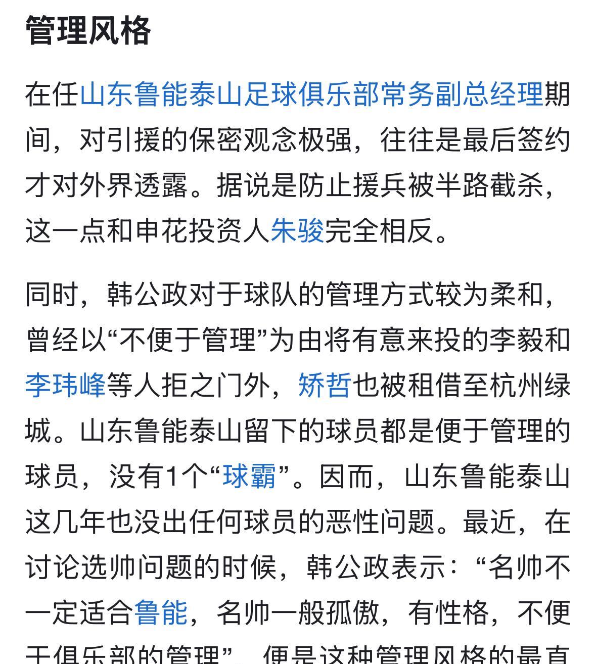 前泰山队常务副总:韩公政 让现在的年轻球迷了解一下,当初泰山队的辉煌和他的管理建设有多大的关系! 图一:韩公政接受当时如日中天的搜狐体育专访! 图二~三:管理风格 图四五六:他人评价(写的特别中肯,没一点夸张,事实如此,我亲身见证) 怀念我的青春,怀念我的鲁能!#山东泰山队#